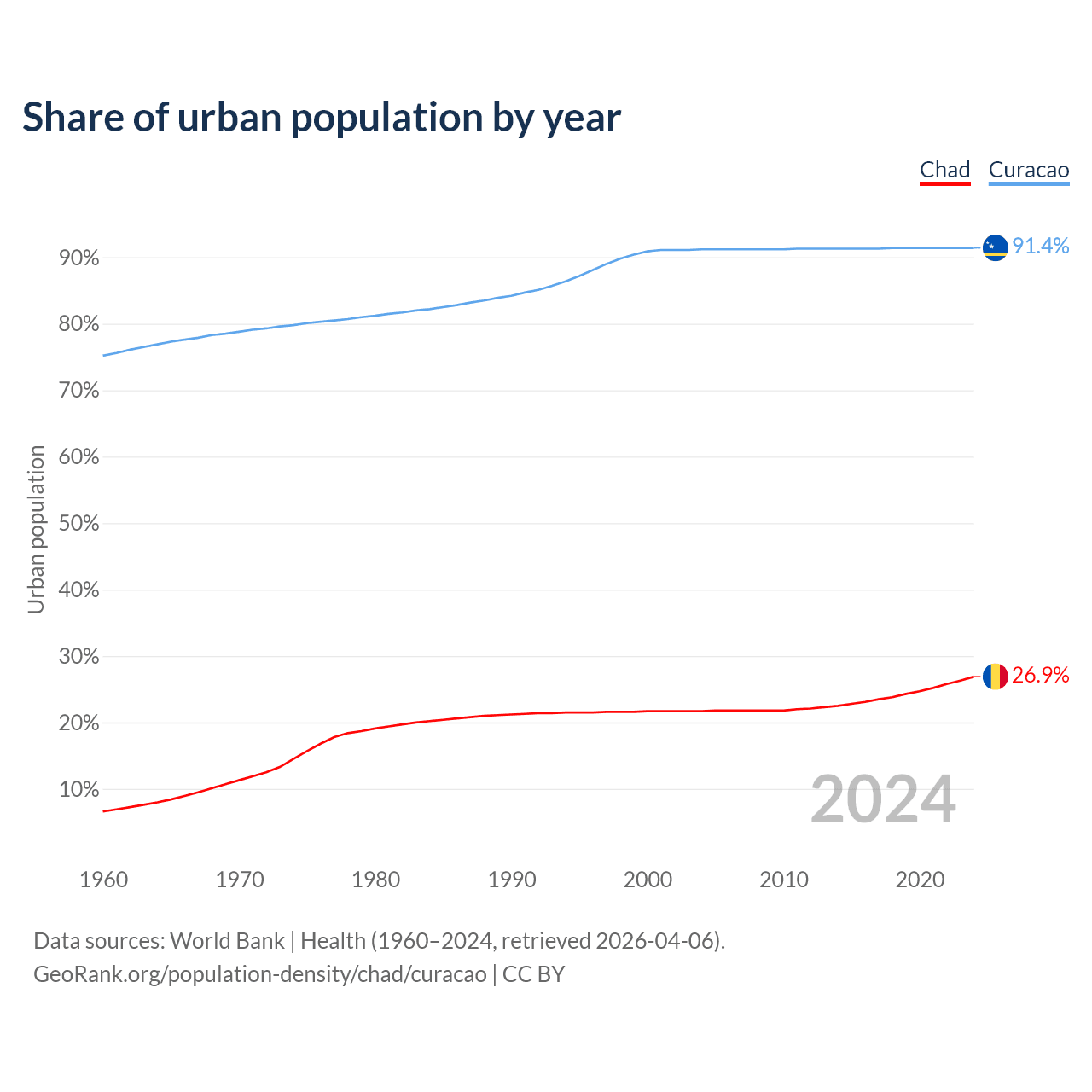 From 2004 to 2024, the share of urban population changed from 21.7% to 26.9% in Chad and from 91.2% to 91.4% in Curacao.