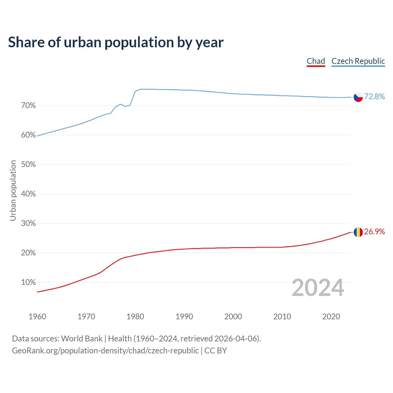 From 2004 to 2024, the share of urban population changed from 21.7% to 26.9% in Chad and from 73.7% to 72.8% in the Czech Republic.