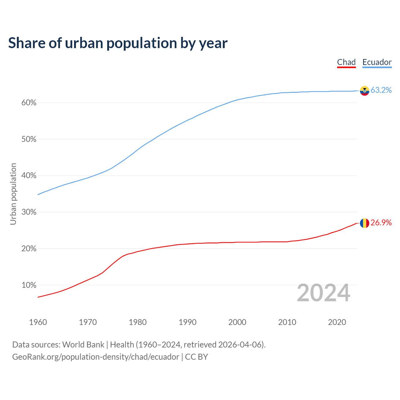 From 2004 to 2024, the share of urban population changed from 21.7% to 26.9% in Chad and from 61.8% to 63.2% in Ecuador.
