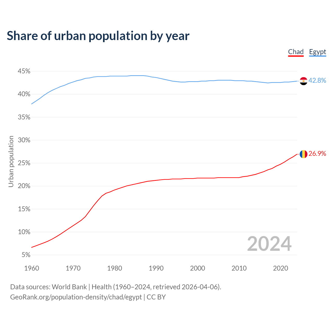 From 2004 to 2024, the share of urban population changed from 21.7% to 26.9% in Chad and from 42.9% to 42.8% in Egypt.