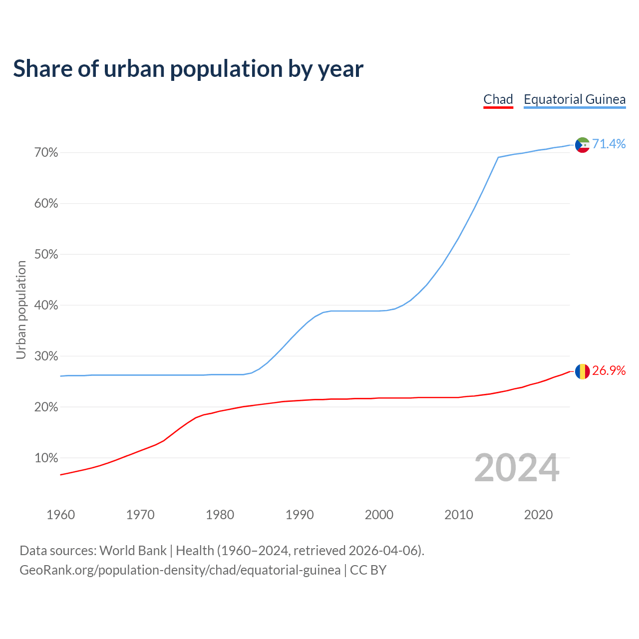 From 2004 to 2024, the share of urban population changed from 21.7% to 26.9% in Chad and from 40.9% to 71.4% in Equatorial Guinea.