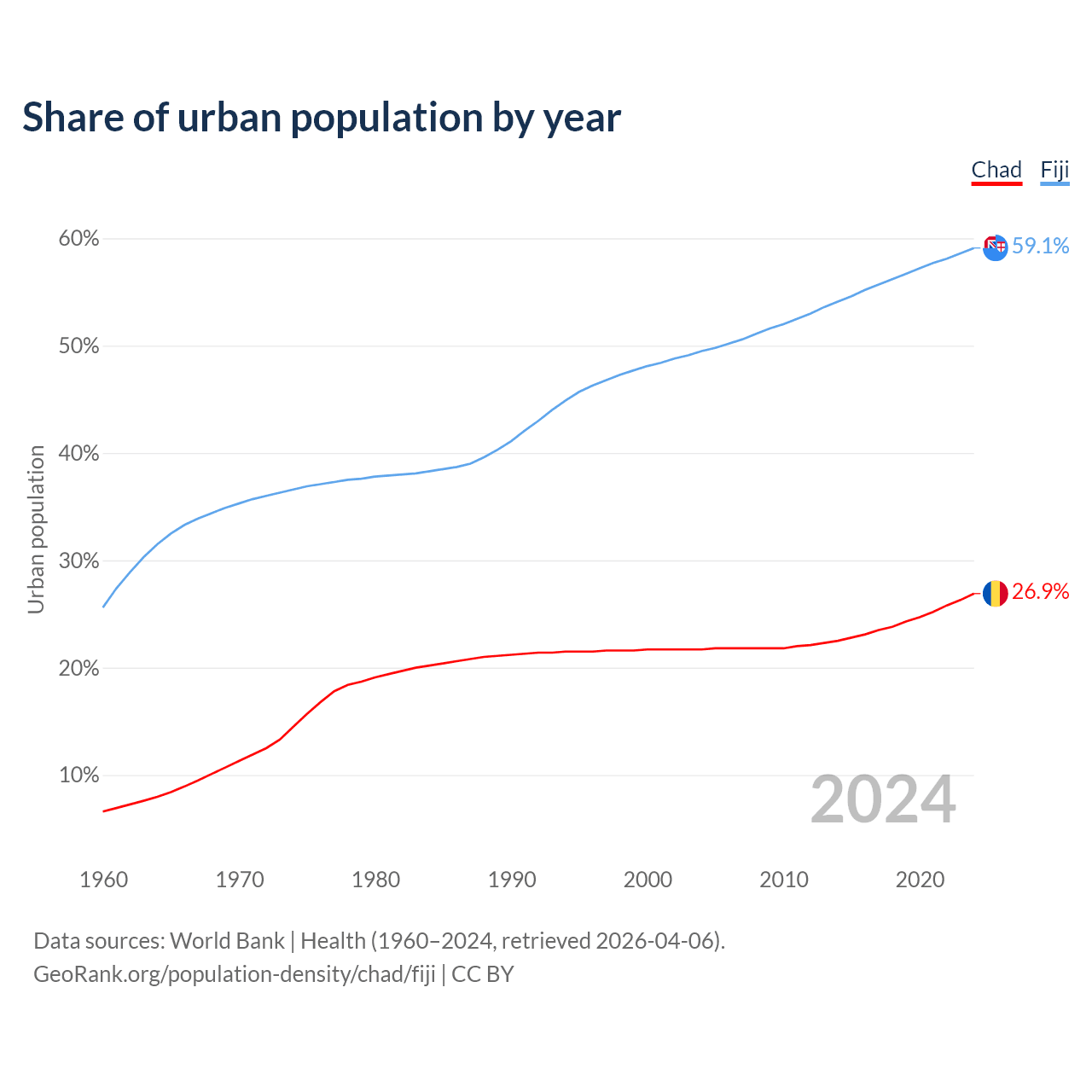From 2004 to 2024, the share of urban population changed from 21.7% to 26.9% in Chad and from 49.5% to 59.1% in Fiji.