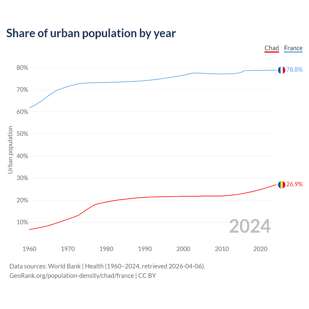 From 2004 to 2024, the share of urban population changed from 21.7% to 26.9% in Chad and from 77.5% to 78.8% in France.