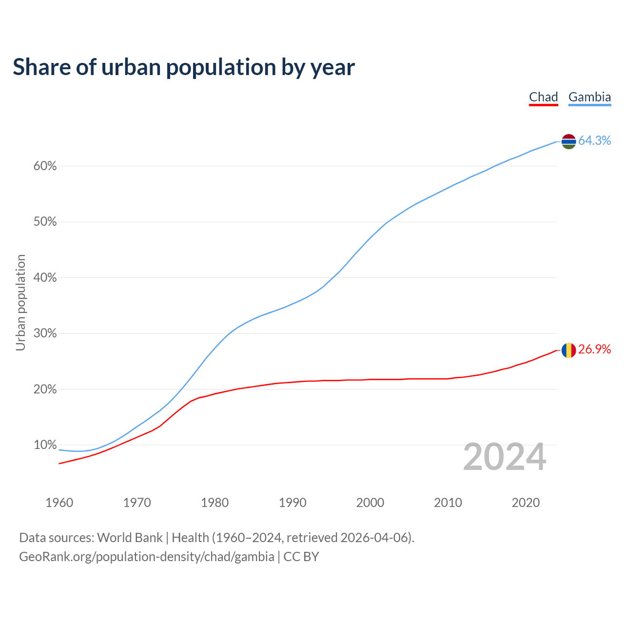 From 2004 to 2024, the share of urban population changed from 21.7% to 26.9% in Chad and from 51.5% to 64.3% in the Gambia.