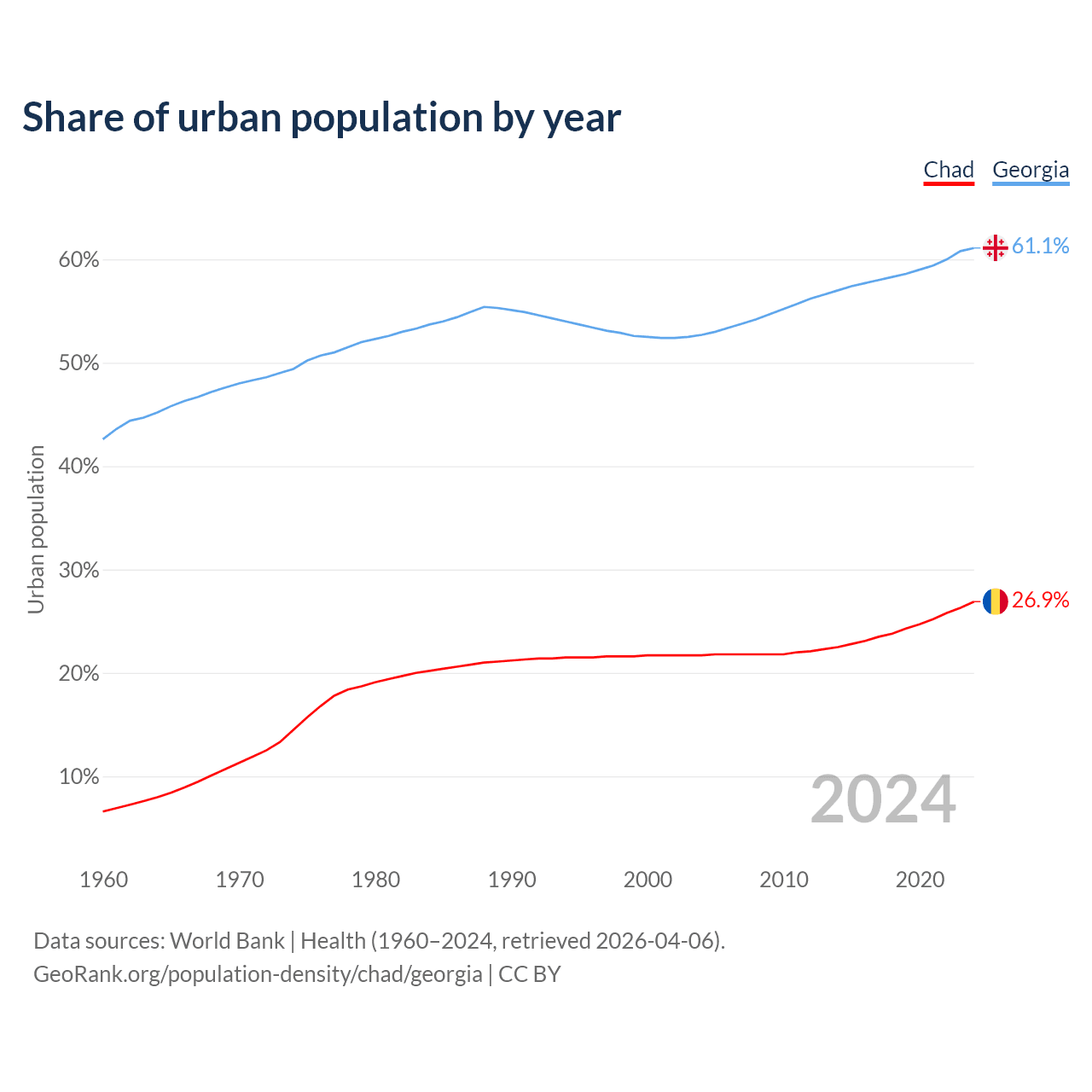 From 2004 to 2024, the share of urban population changed from 21.7% to 26.9% in Chad and from 52.7% to 61.1% in Georgia.