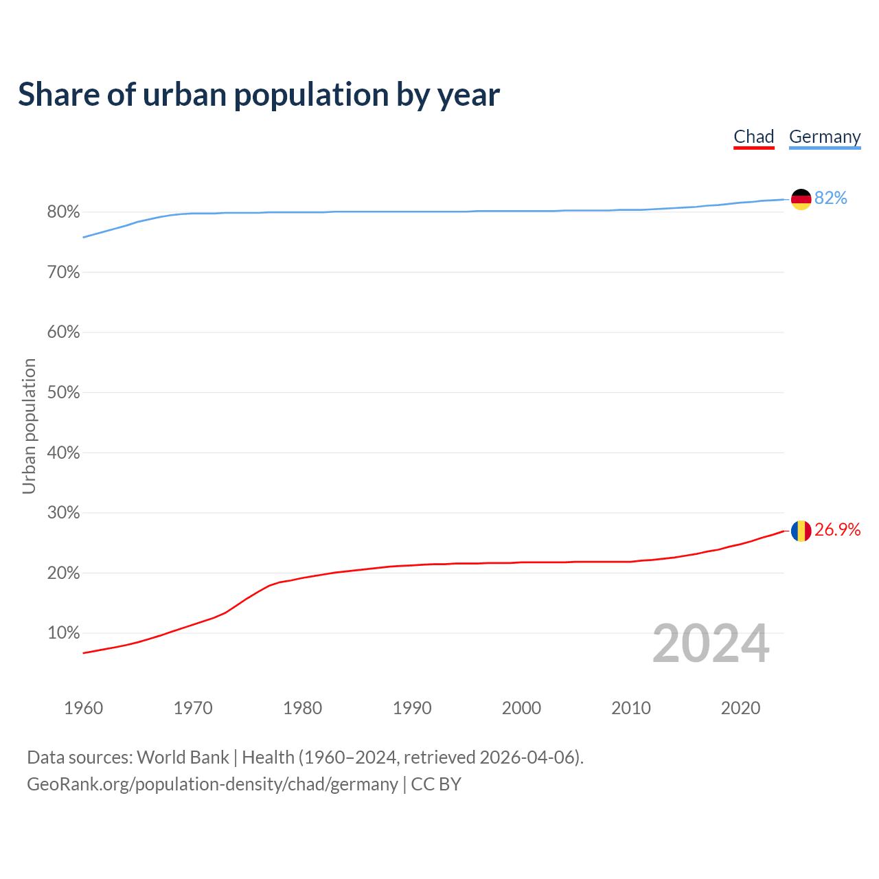 From 2004 to 2024, the share of urban population changed from 21.7% to 26.9% in Chad and from 80.2% to 82% in Germany.