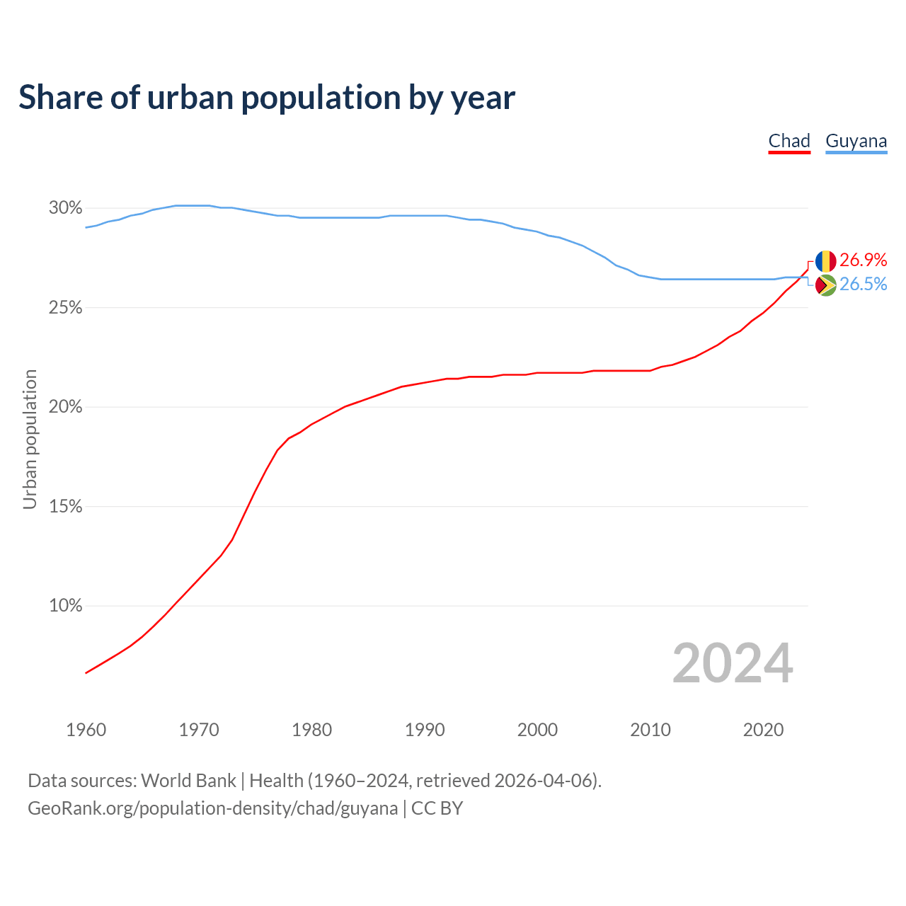 From 2004 to 2024, the share of urban population changed from 21.7% to 26.9% in Chad and from 28.1% to 26.5% in Guyana.