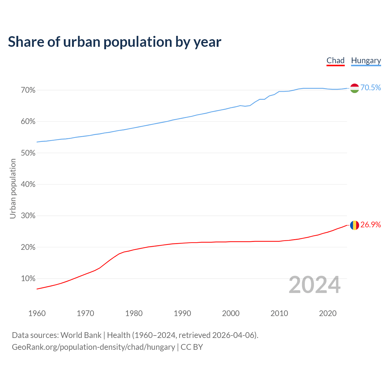 From 2004 to 2024, the share of urban population changed from 21.7% to 26.9% in Chad and from 65% to 70.5% in Hungary.