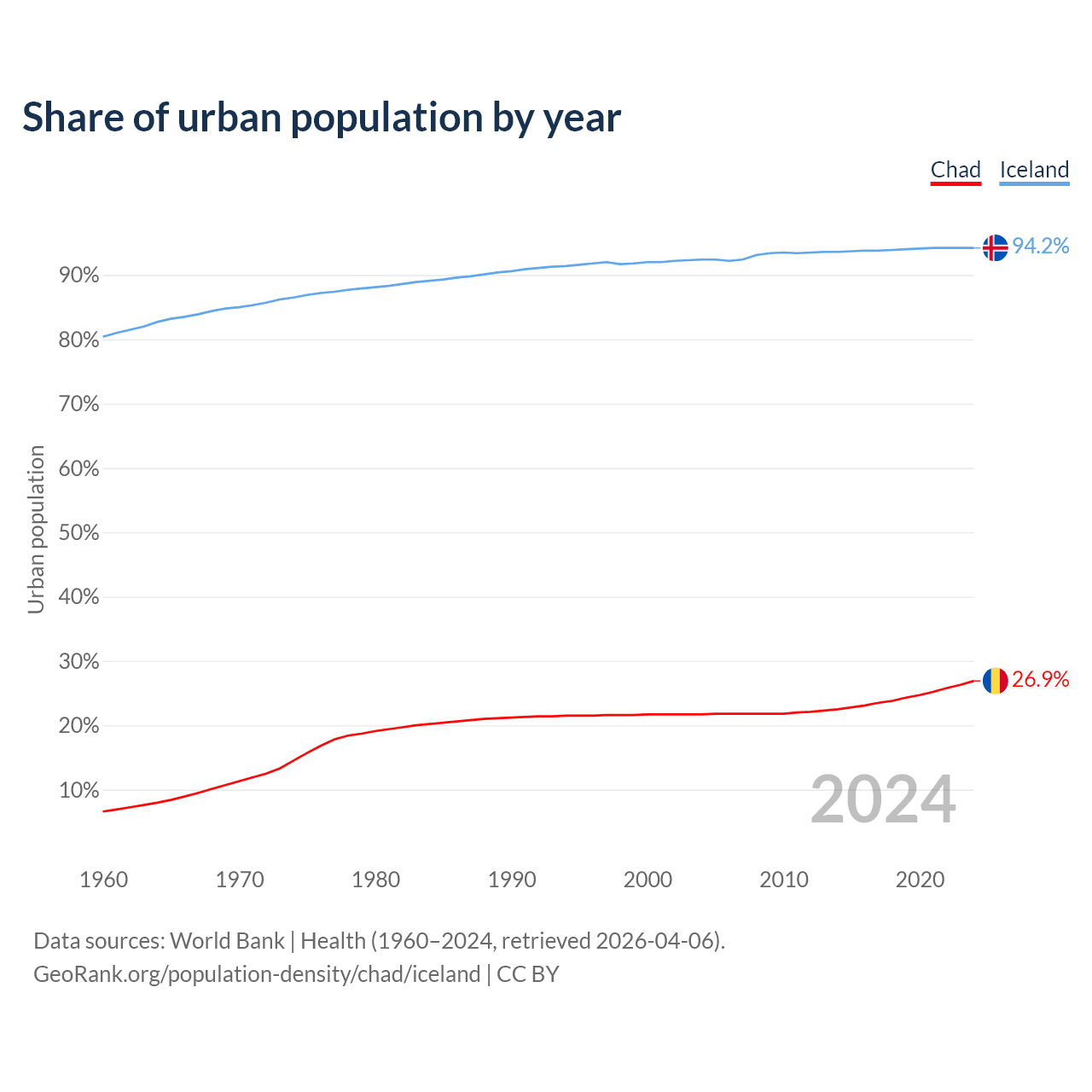 From 2004 to 2024, the share of urban population changed from 21.7% to 26.9% in Chad and from 92.4% to 94.2% in Iceland.