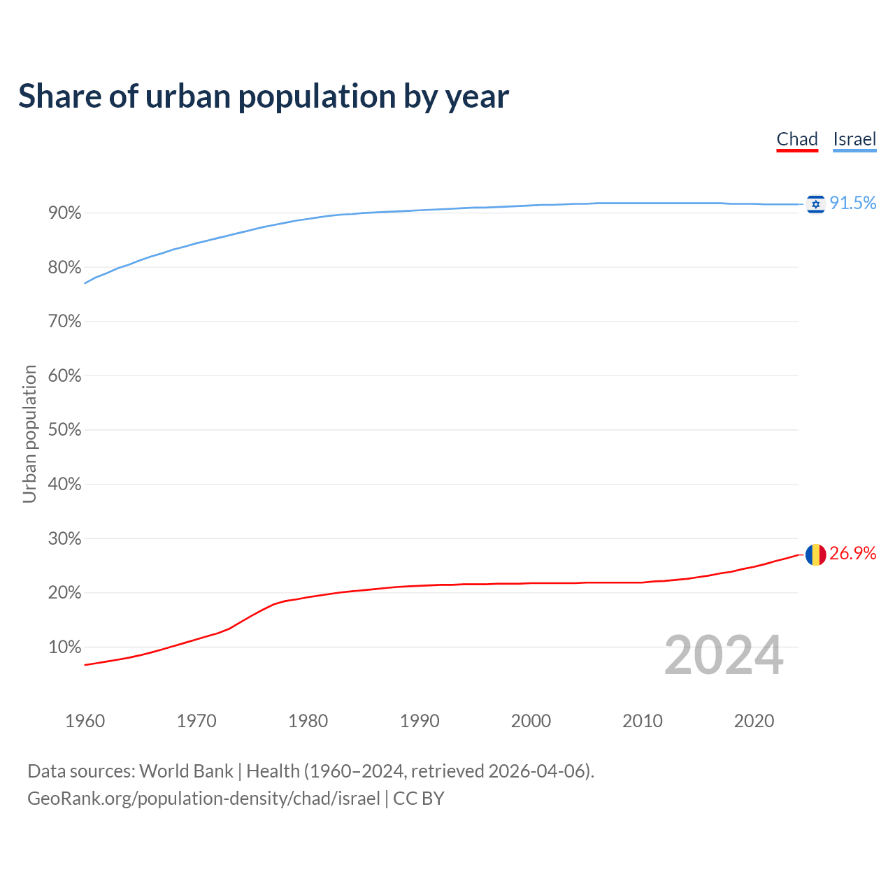 From 2004 to 2024, the share of urban population changed from 21.7% to 26.9% in Chad and from 91.6% to 91.5% in Israel.