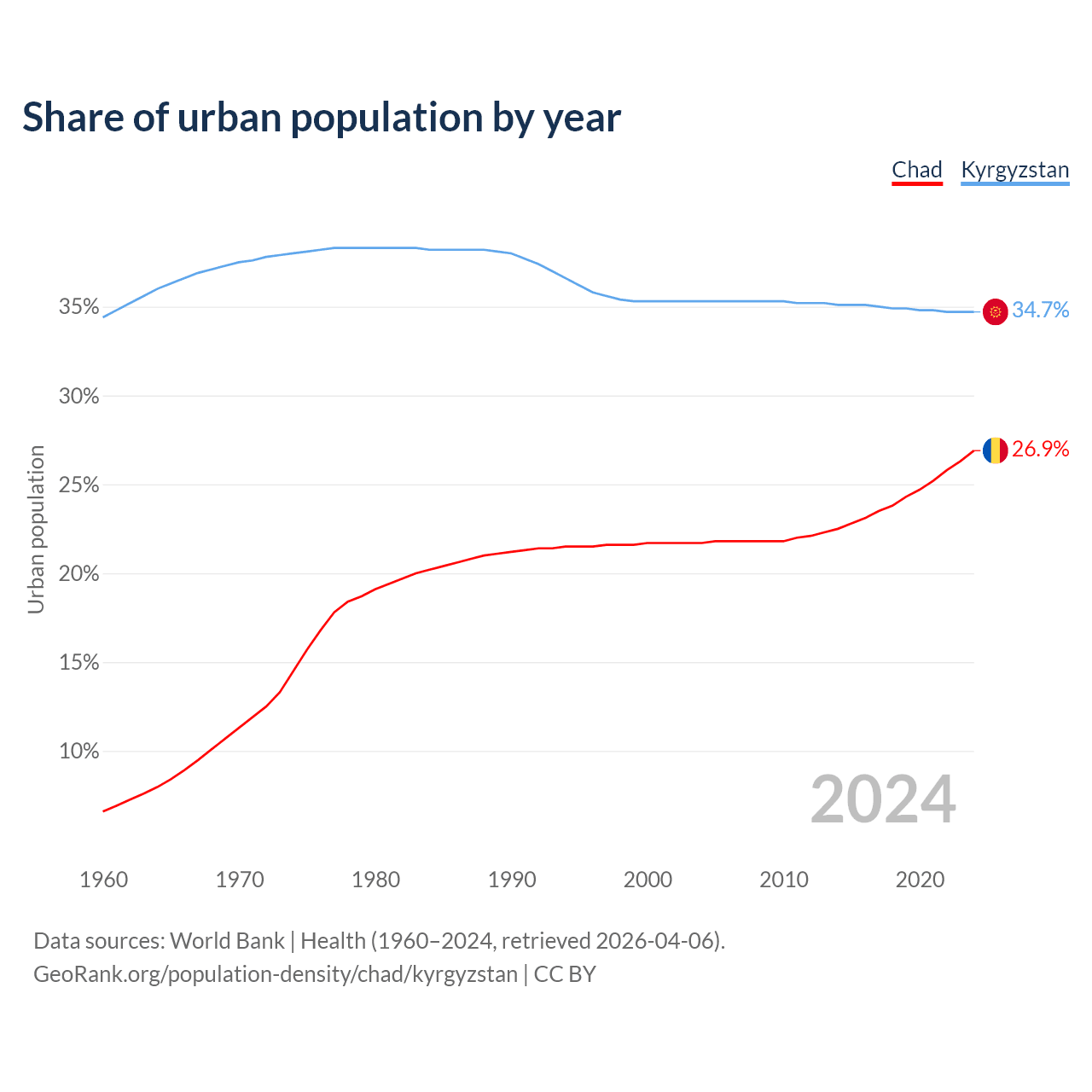 From 2004 to 2024, the share of urban population changed from 21.7% to 26.9% in Chad and from 35.3% to 34.7% in Kyrgyzstan.