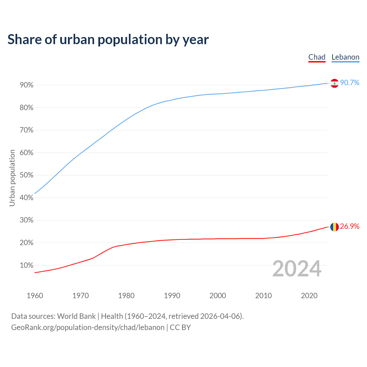 From 2004 to 2024, the share of urban population changed from 21.7% to 26.9% in Chad and from 86.6% to 90.7% in Lebanon.