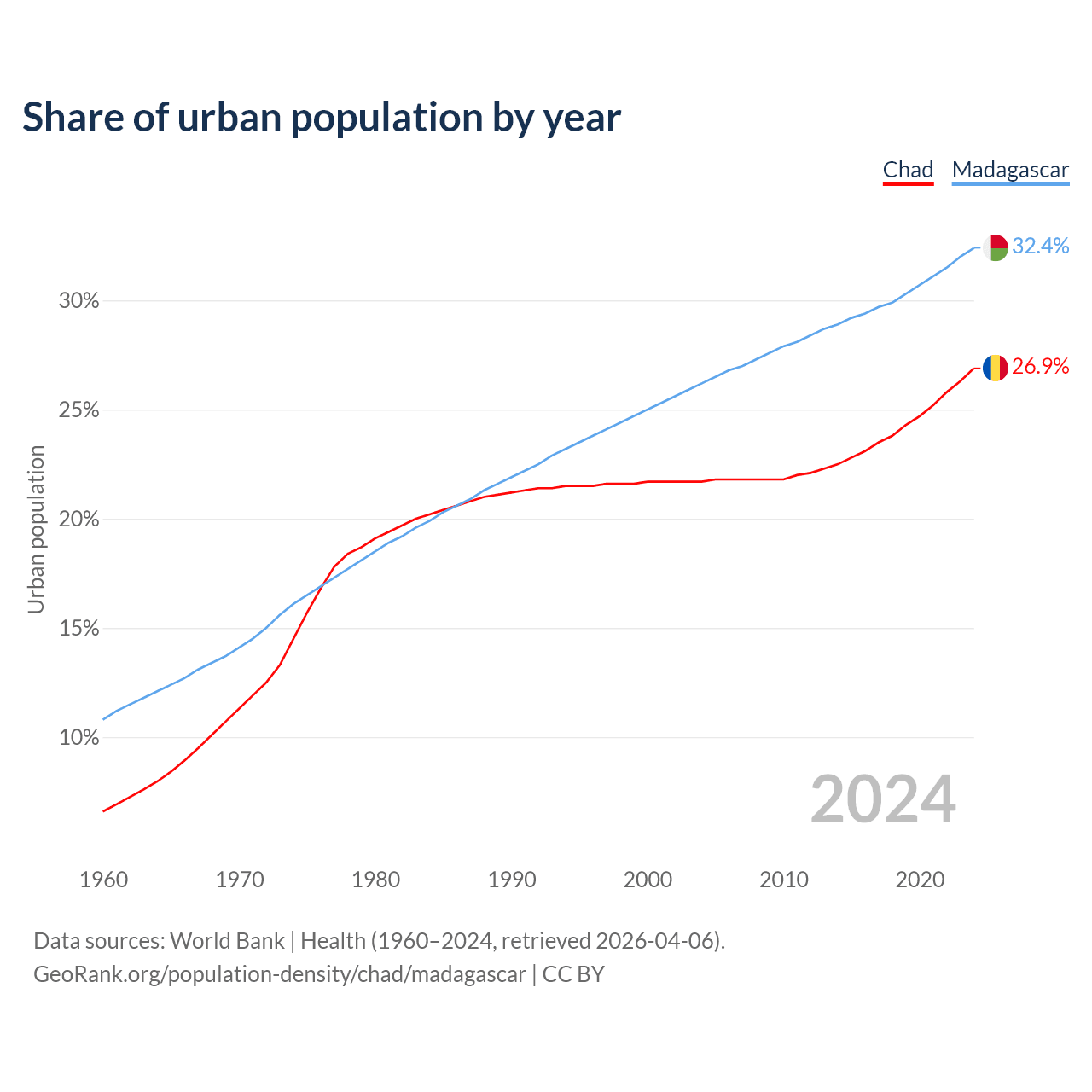 From 2004 to 2024, the share of urban population changed from 21.7% to 26.9% in Chad and from 26.2% to 32.4% in Madagascar.
