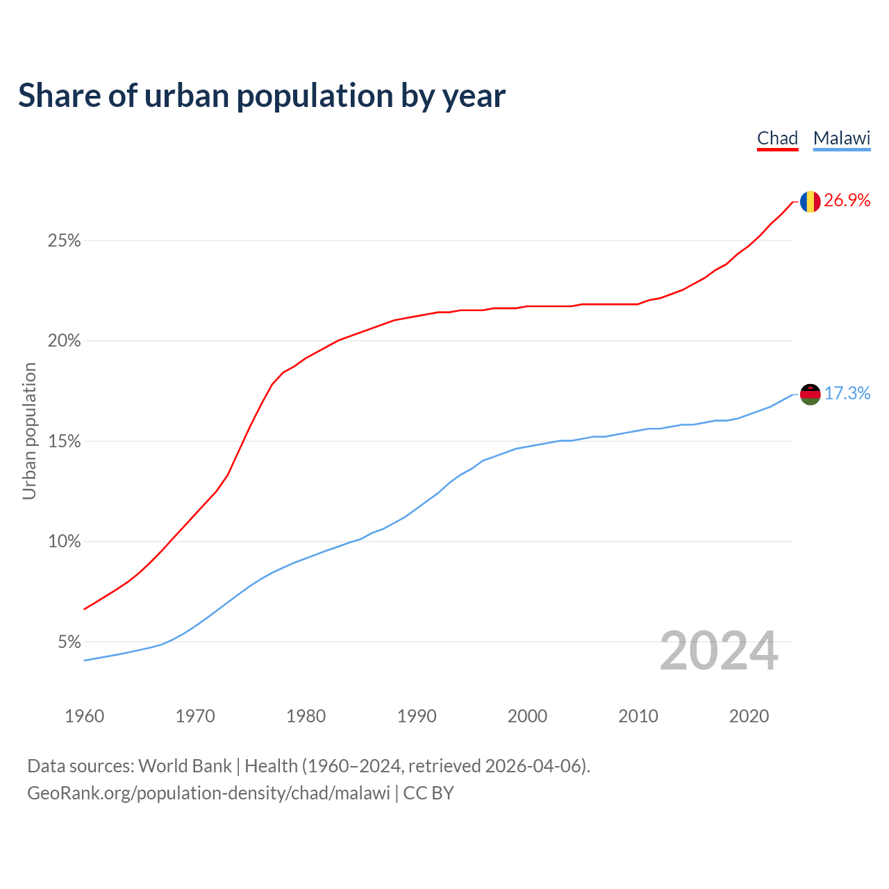 From 2004 to 2024, the share of urban population changed from 21.7% to 26.9% in Chad and from 15% to 17.3% in Malawi.