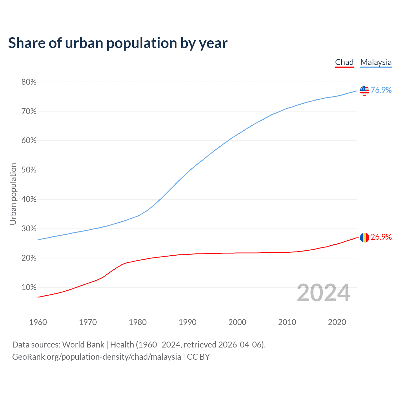 From 2004 to 2024, the share of urban population changed from 21.7% to 26.9% in Chad and from 66.1% to 76.9% in Malaysia.