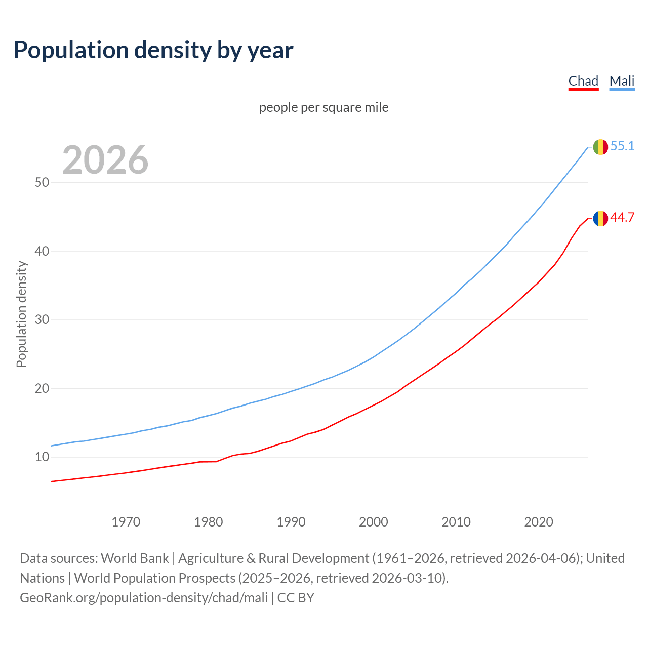 From 2006 to 2026, population density in Chad increased by 103%, compared to a 85.4% growth in Mali.