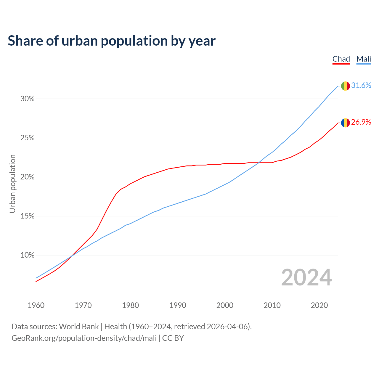 From 2004 to 2024, the share of urban population changed from 21.7% to 26.9% in Chad and from 20.5% to 31.6% in Mali.
