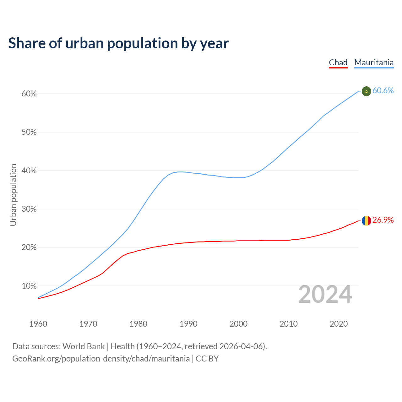 From 2004 to 2024, the share of urban population changed from 21.7% to 26.9% in Chad and from 39.6% to 60.6% in Mauritania.