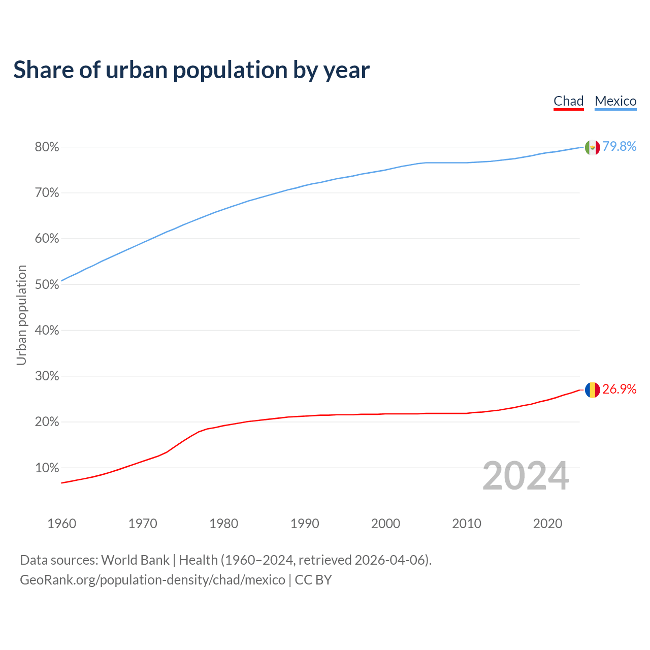 From 2004 to 2024, the share of urban population changed from 21.7% to 26.9% in Chad and from 76.3% to 79.8% in Mexico.