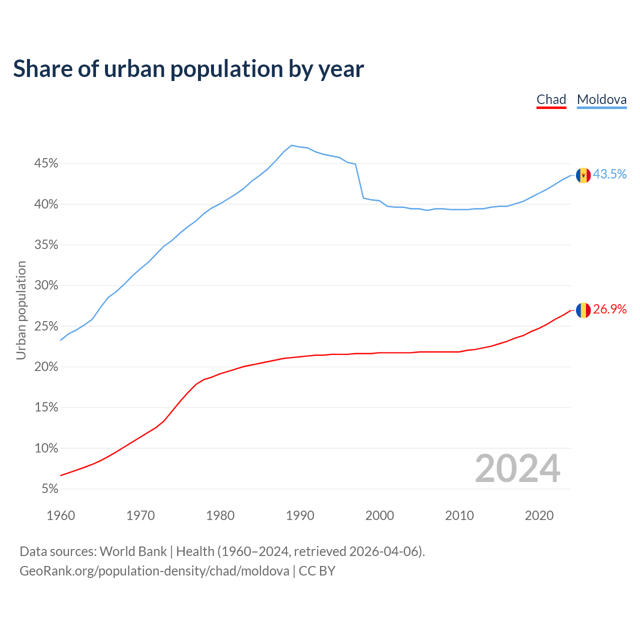 From 2004 to 2024, the share of urban population changed from 21.7% to 26.9% in Chad and from 39.4% to 43.5% in Moldova.
