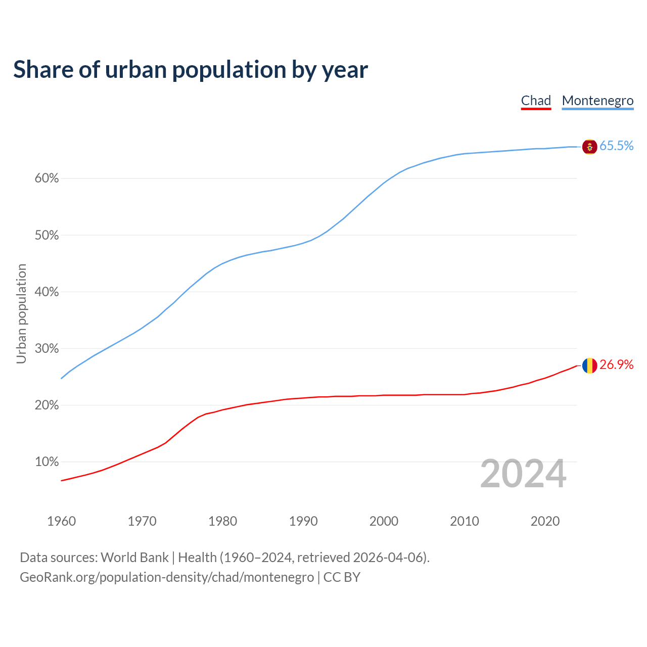 From 2004 to 2024, the share of urban population changed from 21.7% to 26.9% in Chad and from 62.2% to 65.5% in Montenegro.