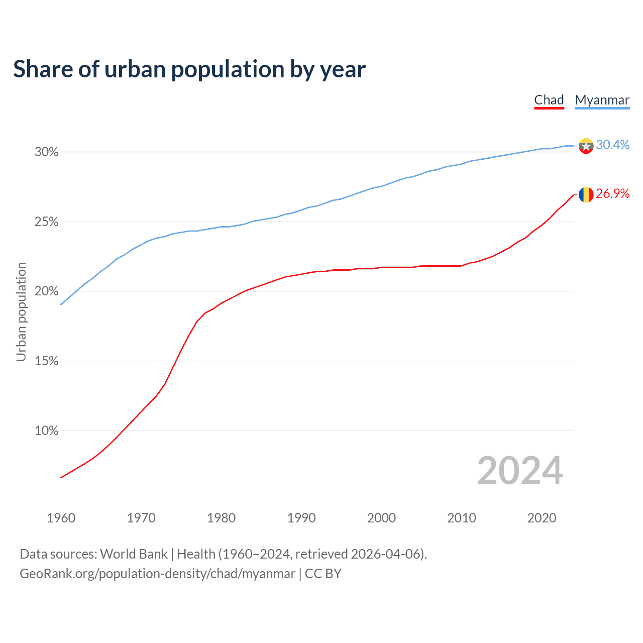 From 2004 to 2024, the share of urban population changed from 21.7% to 26.9% in Chad and from 28.2% to 30.4% in Myanmar.