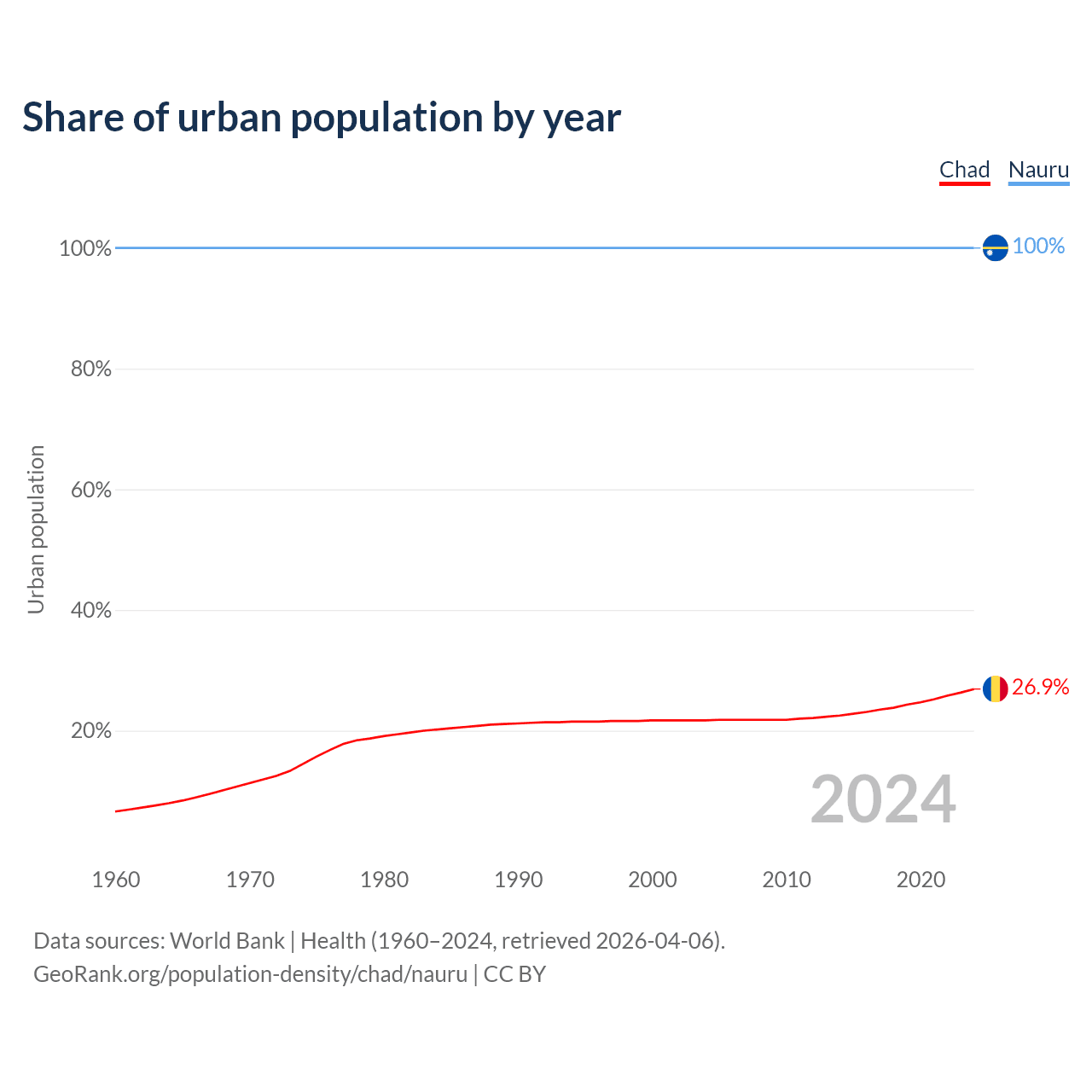 From 2004 to 2024, the share of urban population changed from 21.7% to 26.9% in Chad and from 100% to 100% in Nauru.