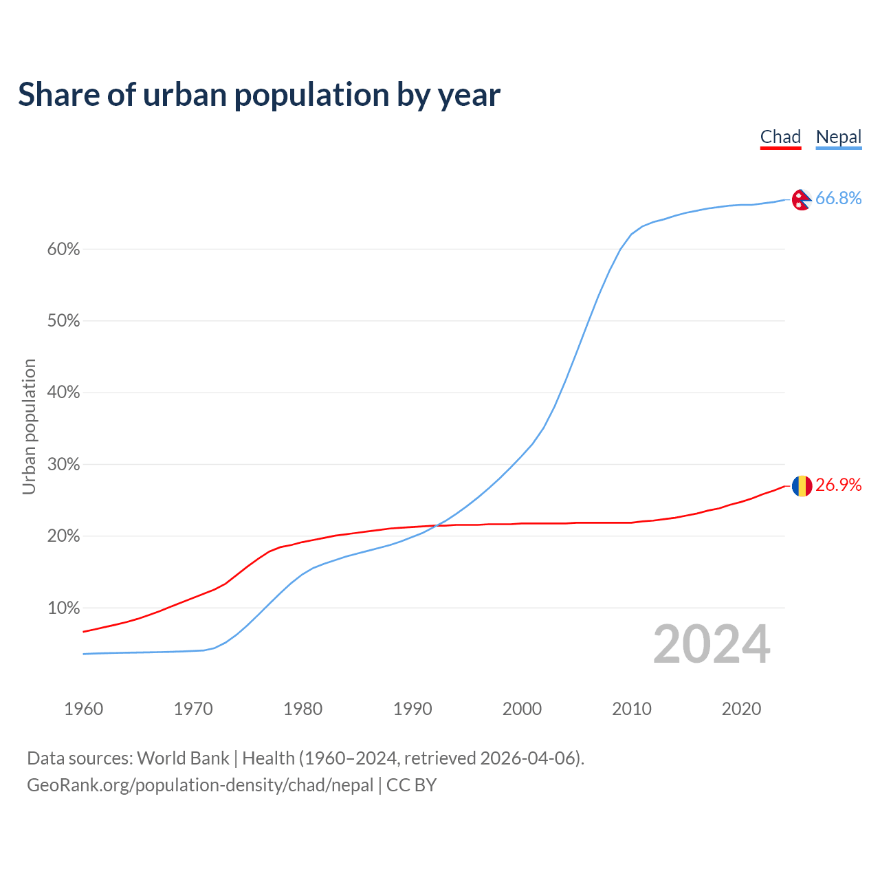 From 2004 to 2024, the share of urban population changed from 21.7% to 26.9% in Chad and from 41.6% to 66.8% in Nepal.