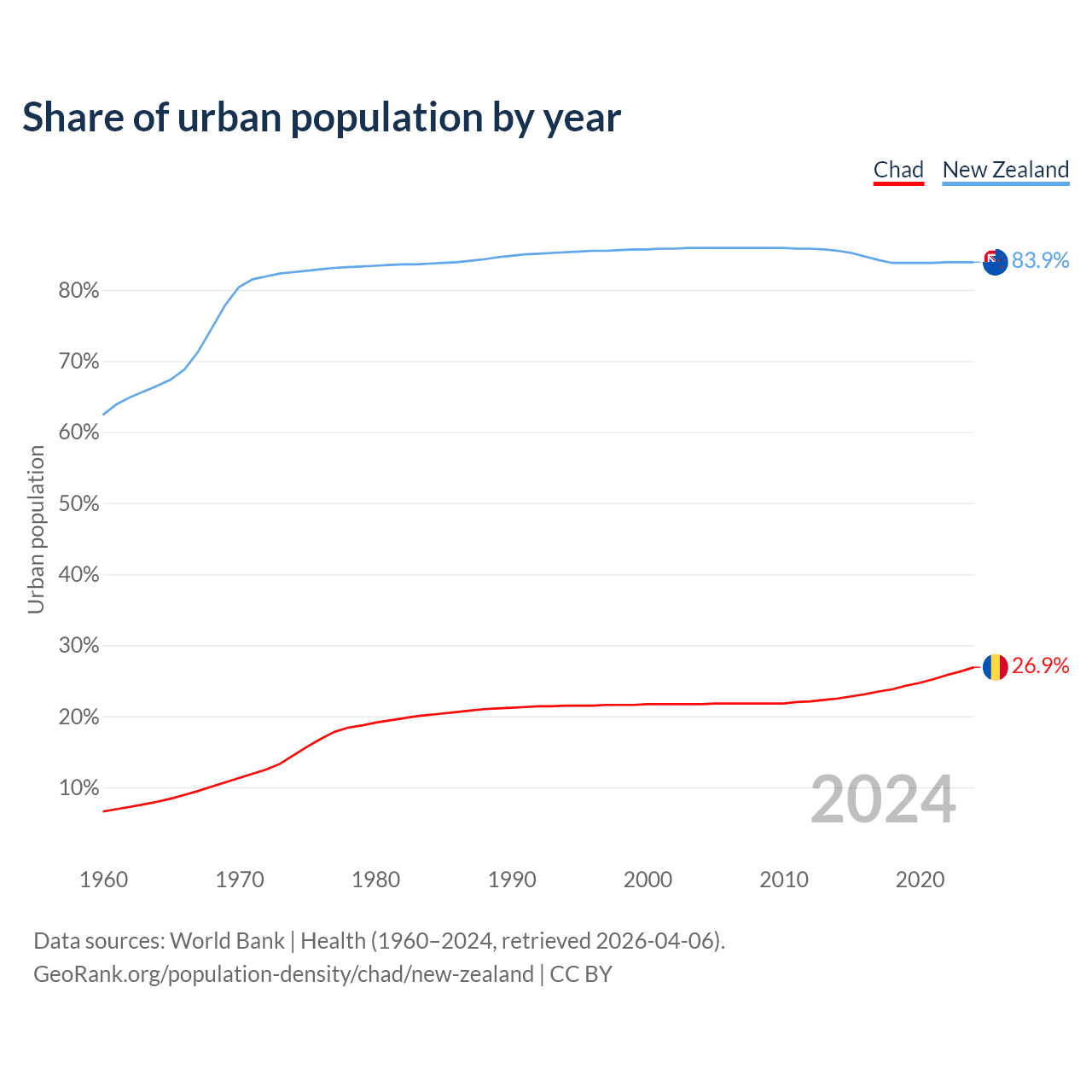 From 2004 to 2024, the share of urban population changed from 21.7% to 26.9% in Chad and from 85.9% to 83.9% in New Zealand.