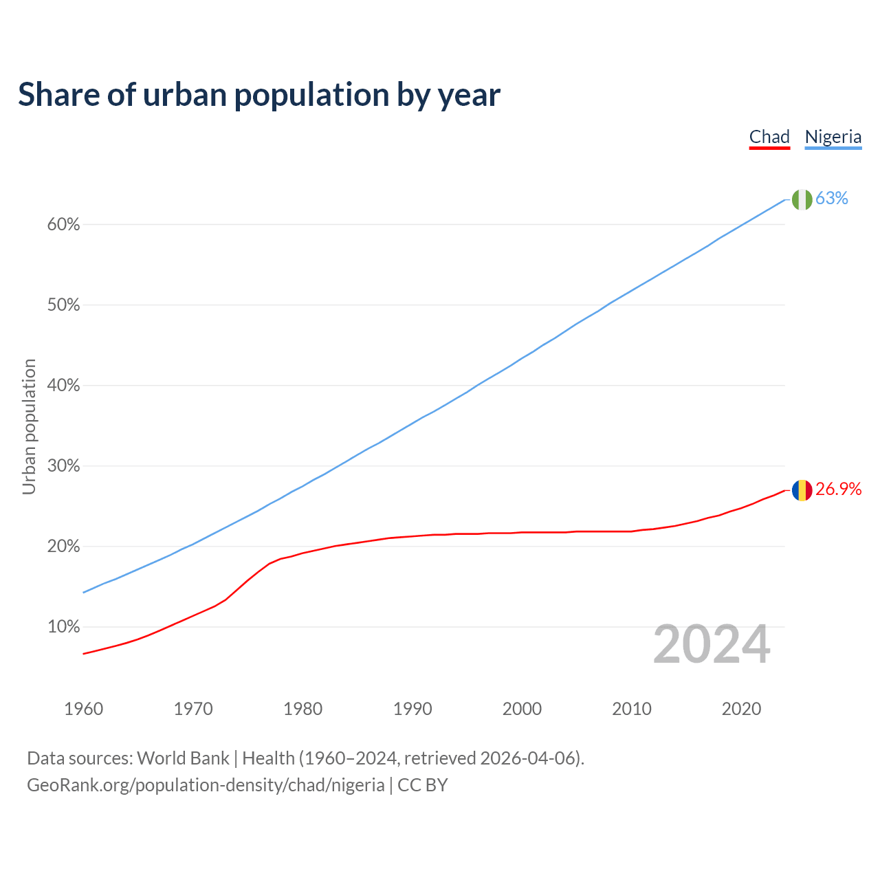 From 2004 to 2024, the share of urban population changed from 21.7% to 26.9% in Chad and from 46.7% to 63% in Nigeria.