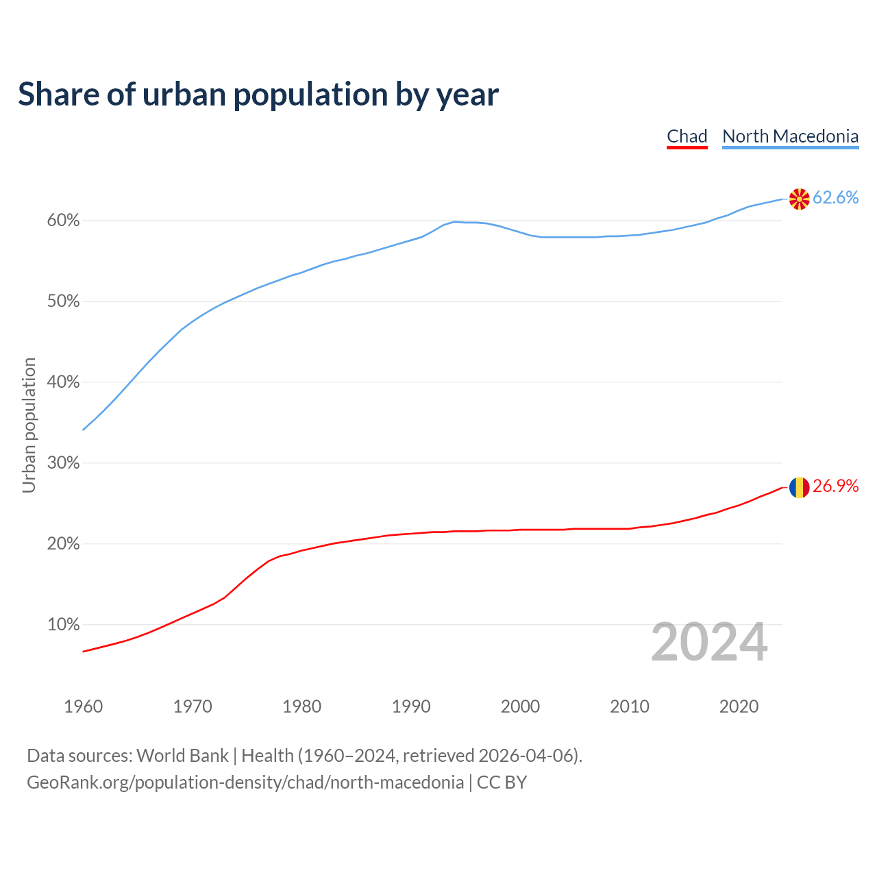 From 2004 to 2024, the share of urban population changed from 21.7% to 26.9% in Chad and from 57.9% to 62.6% in North Macedonia.