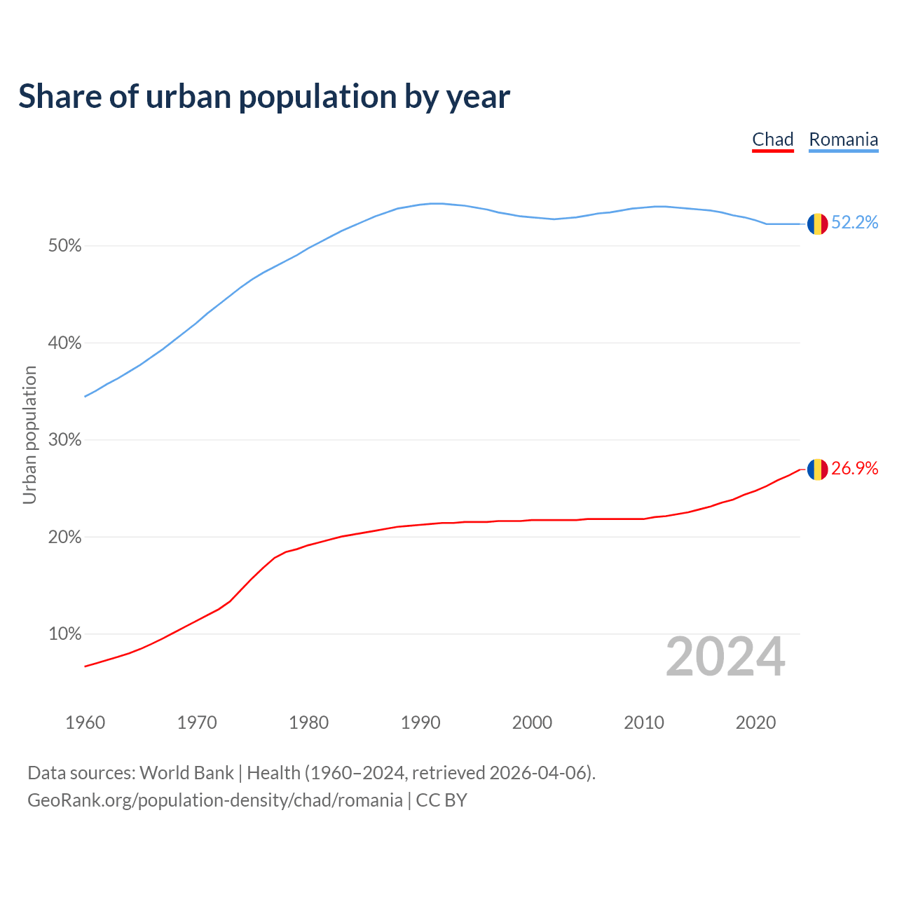 From 2004 to 2024, the share of urban population changed from 21.7% to 26.9% in Chad and from 52.9% to 52.2% in Romania.