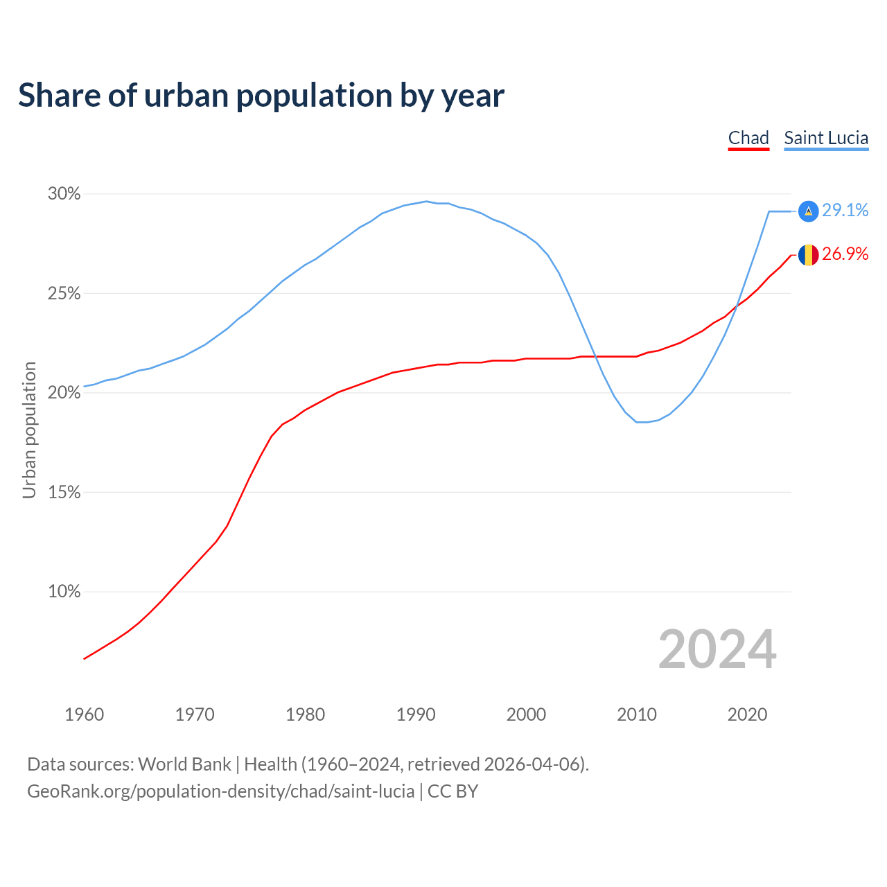 From 2004 to 2024, the share of urban population changed from 21.7% to 26.9% in Chad and from 24.8% to 29.1% in Saint Lucia.