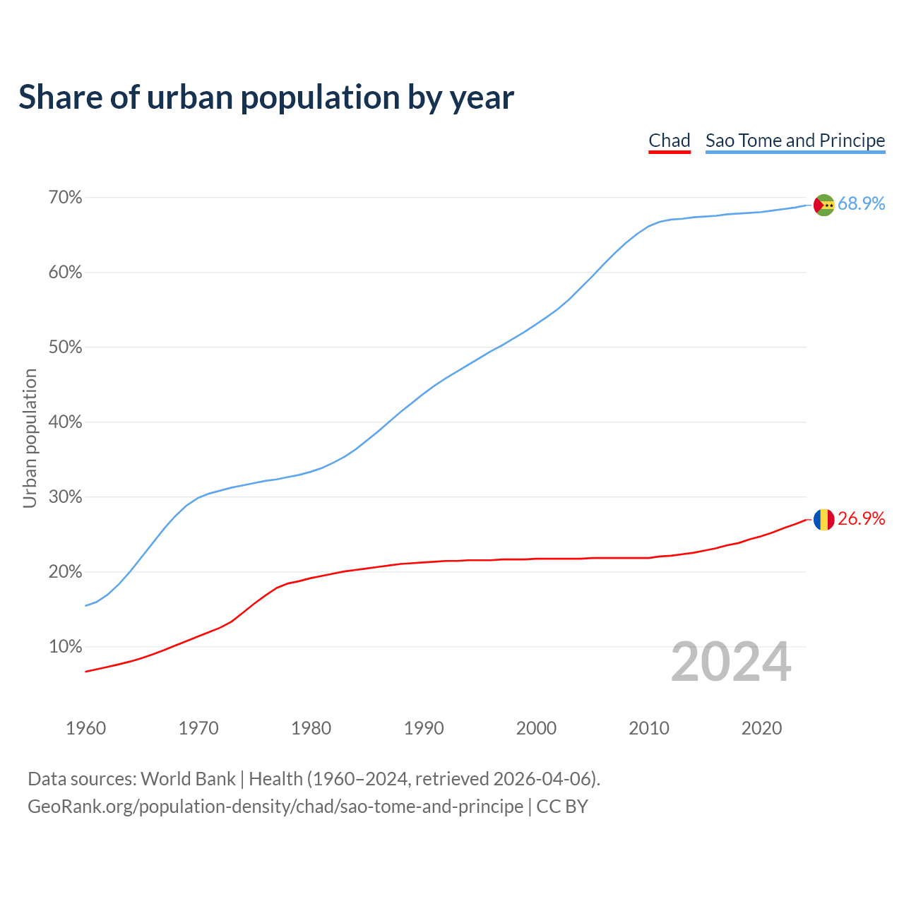 From 2004 to 2024, the share of urban population changed from 21.7% to 26.9% in Chad and from 57.9% to 68.9% in Sao Tome and Principe.