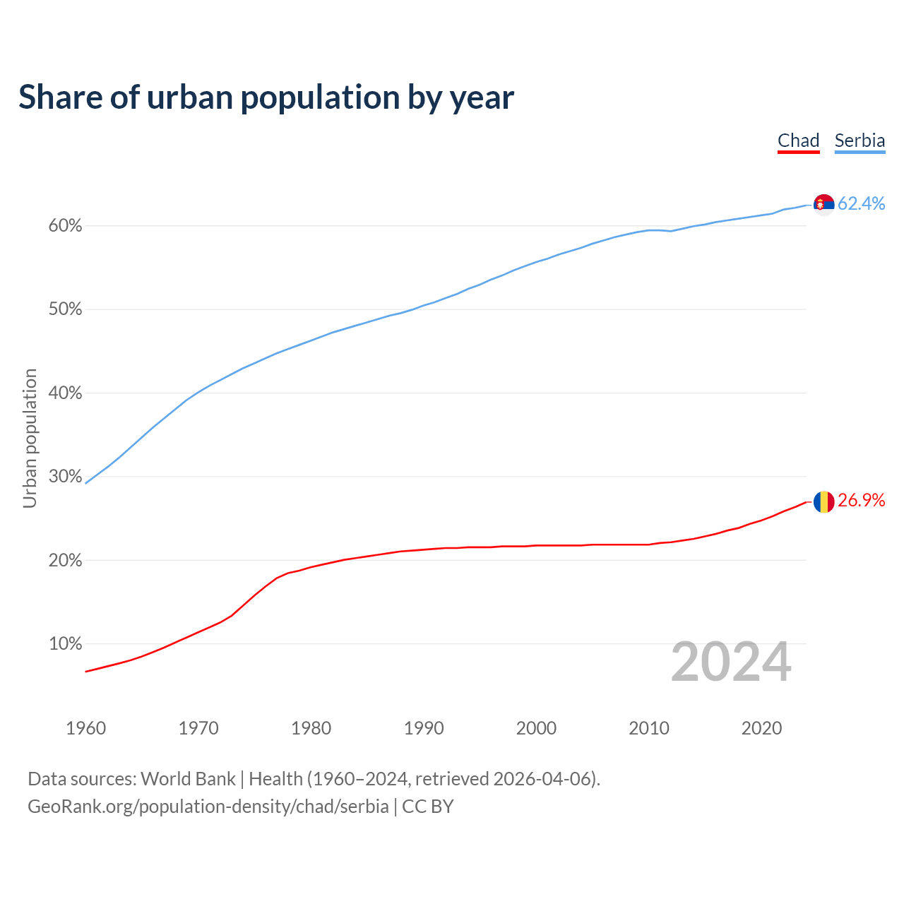 From 2004 to 2024, the share of urban population changed from 21.7% to 26.9% in Chad and from 57.3% to 62.4% in Serbia.