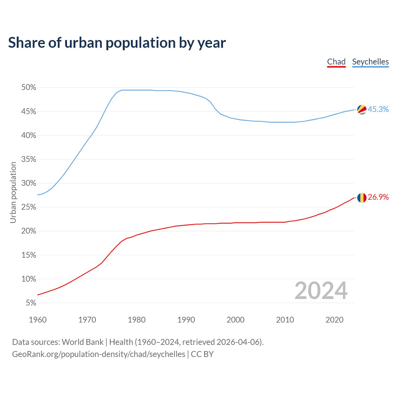 From 2004 to 2024, the share of urban population changed from 21.7% to 26.9% in Chad and from 42.9% to 45.3% in the Seychelles.