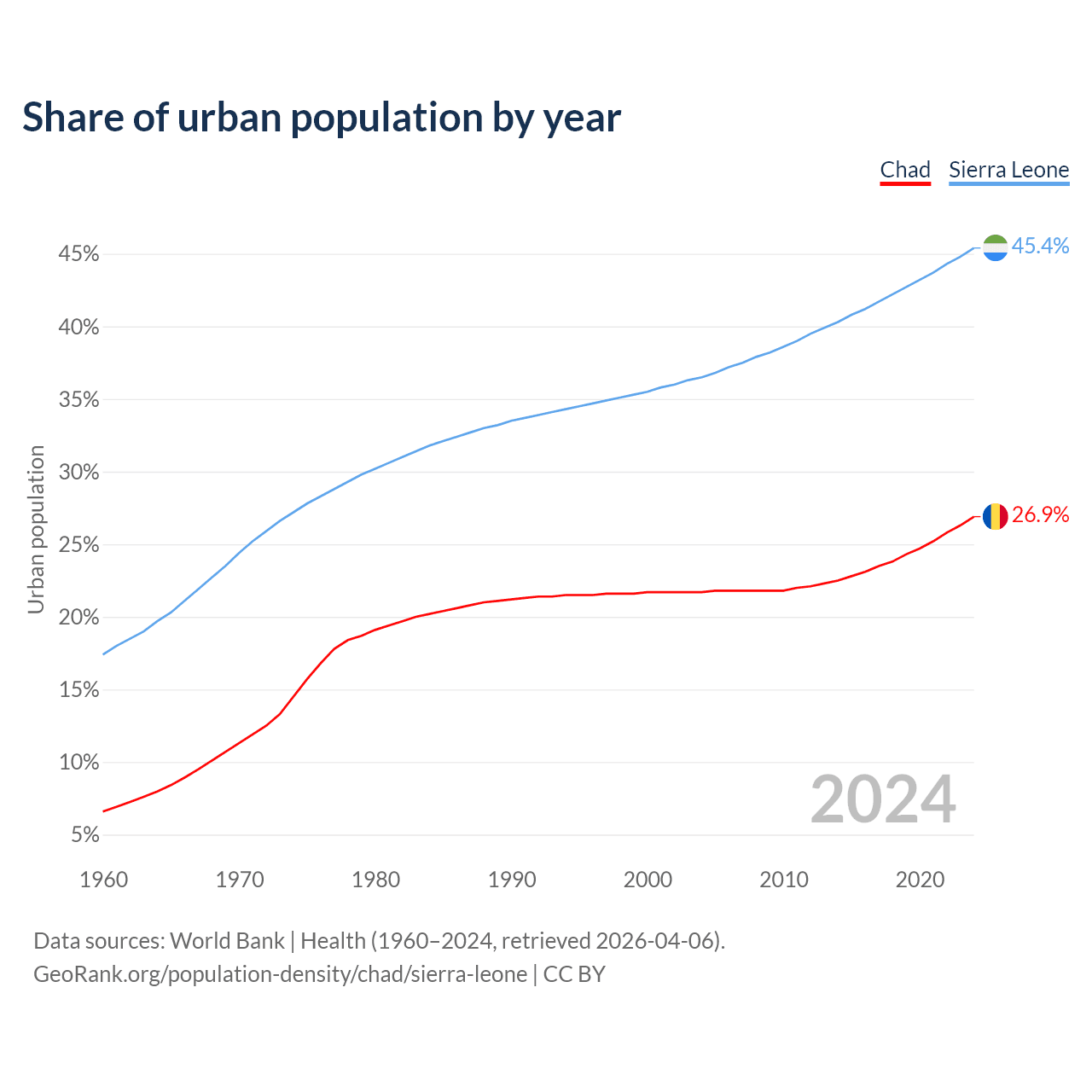 From 2004 to 2024, the share of urban population changed from 21.7% to 26.9% in Chad and from 36.5% to 45.4% in Sierra Leone.