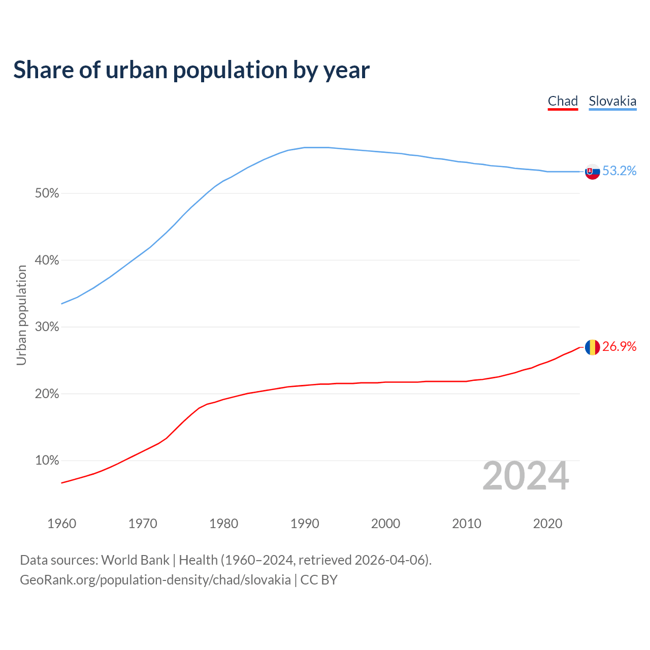 From 2004 to 2024, the share of urban population changed from 21.7% to 26.9% in Chad and from 55.6% to 53.2% in Slovakia.