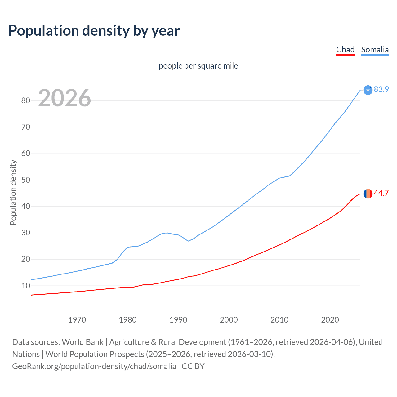 From 2006 to 2026, population density in Chad increased by 103%, compared to a 85.2% growth in Somalia.
