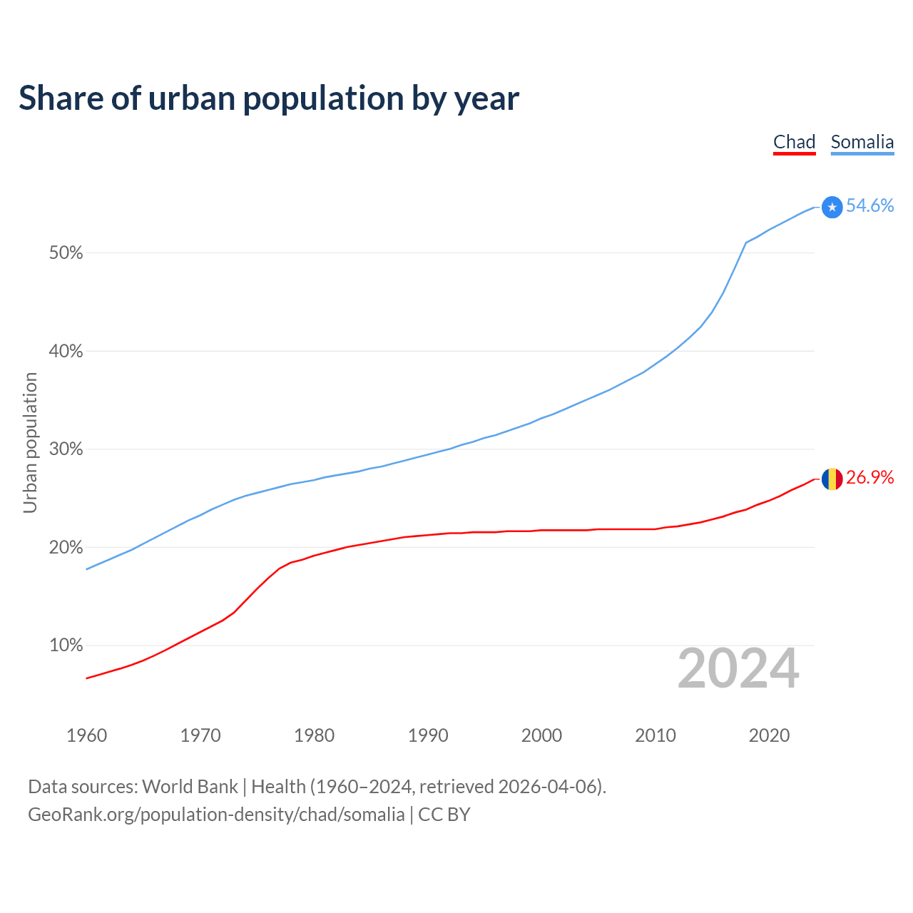 From 2004 to 2024, the share of urban population changed from 21.7% to 26.9% in Chad and from 35% to 54.6% in Somalia.
