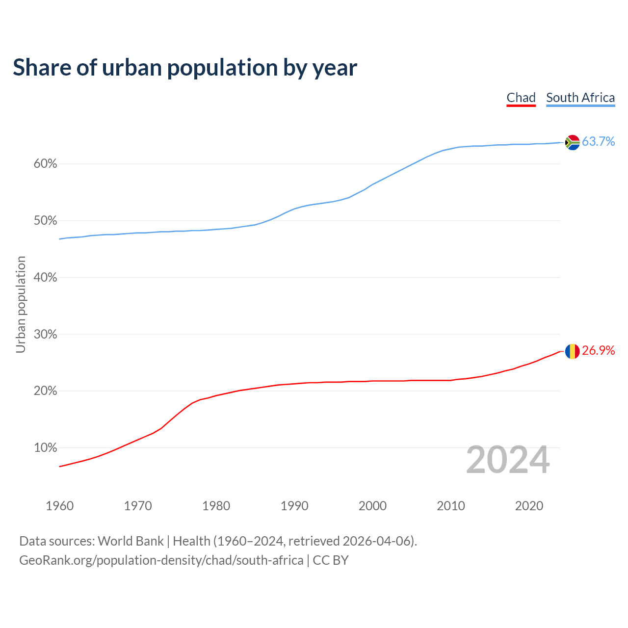 From 2004 to 2024, the share of urban population changed from 21.7% to 26.9% in Chad and from 59.1% to 63.7% in South Africa.