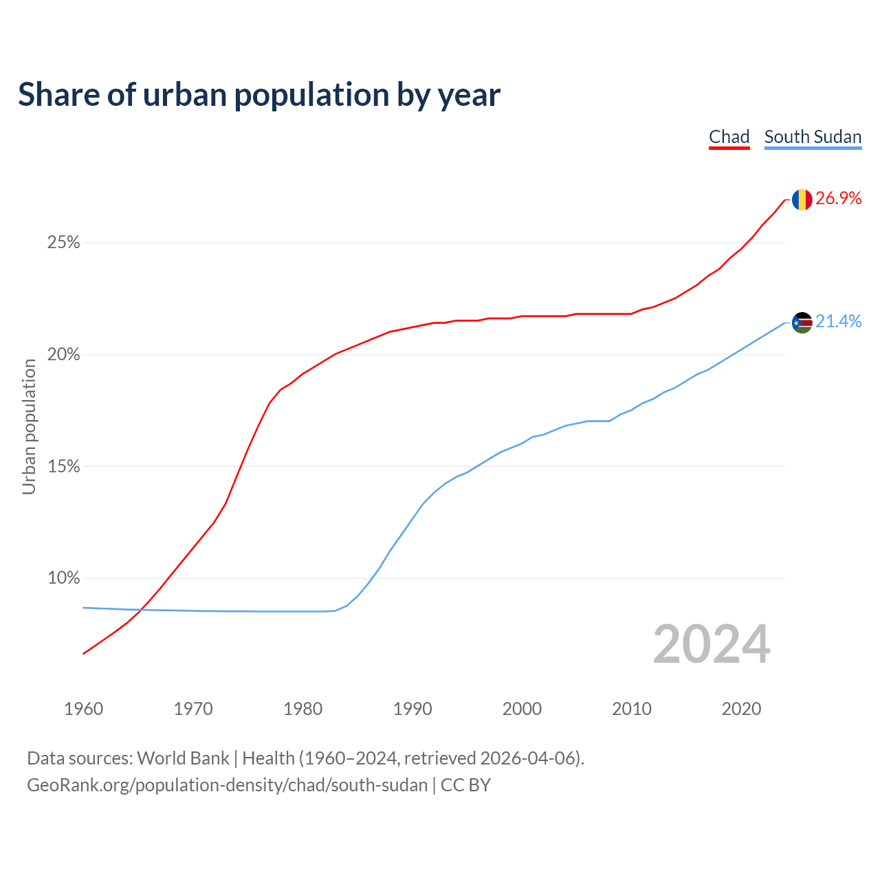 From 2004 to 2024, the share of urban population changed from 21.7% to 26.9% in Chad and from 16.8% to 21.4% in South Sudan.