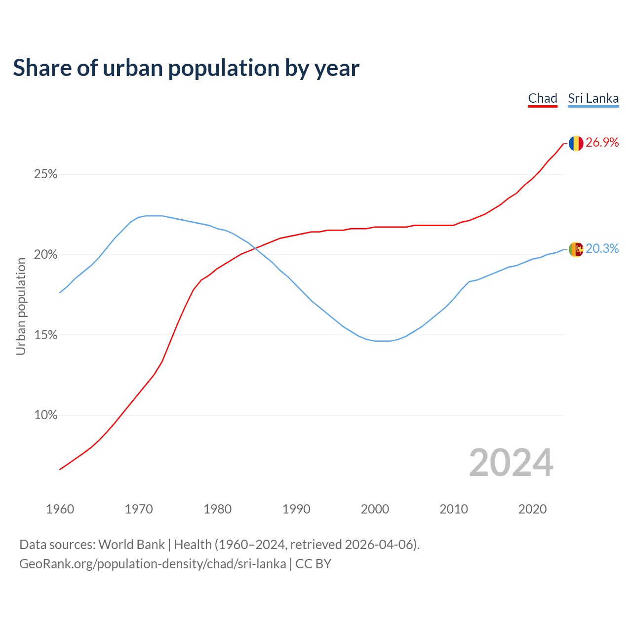 From 2004 to 2024, the share of urban population changed from 21.7% to 26.9% in Chad and from 14.9% to 20.3% in Sri Lanka.