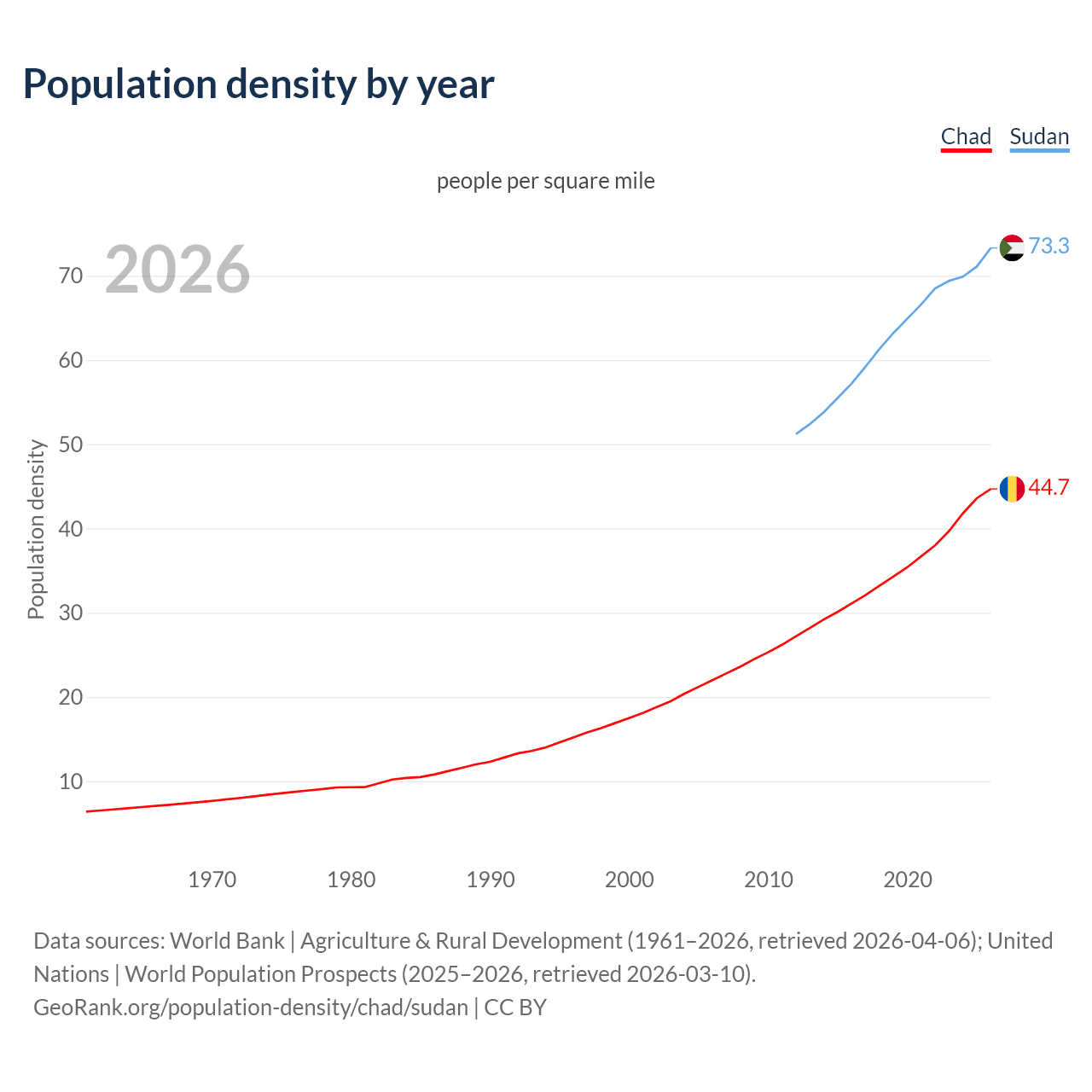 From 2012 to 2026, population density in Chad increased by 64.5%, compared to a 43.3% growth in Sudan.