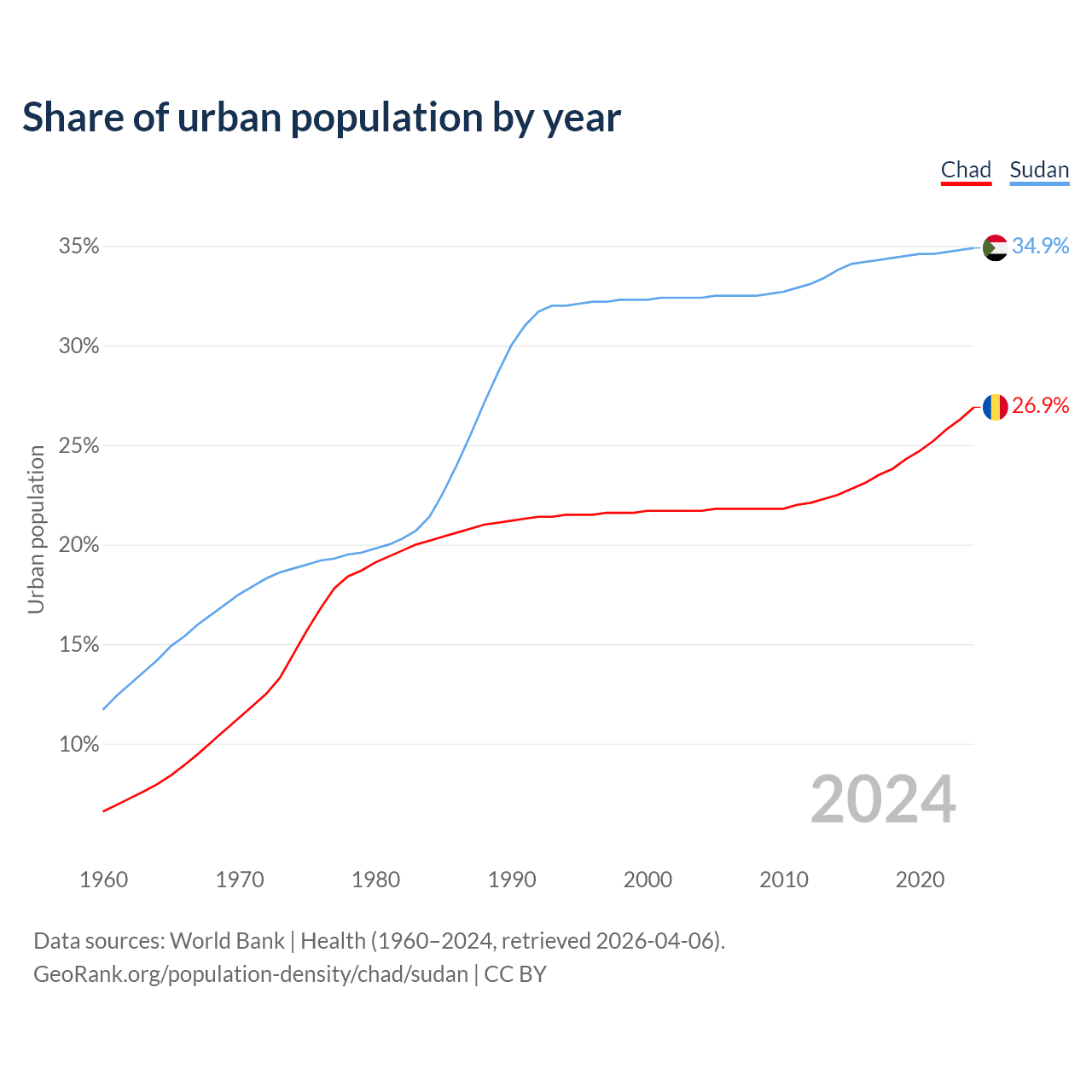 From 2004 to 2024, the share of urban population changed from 21.7% to 26.9% in Chad and from 32.4% to 34.9% in Sudan.