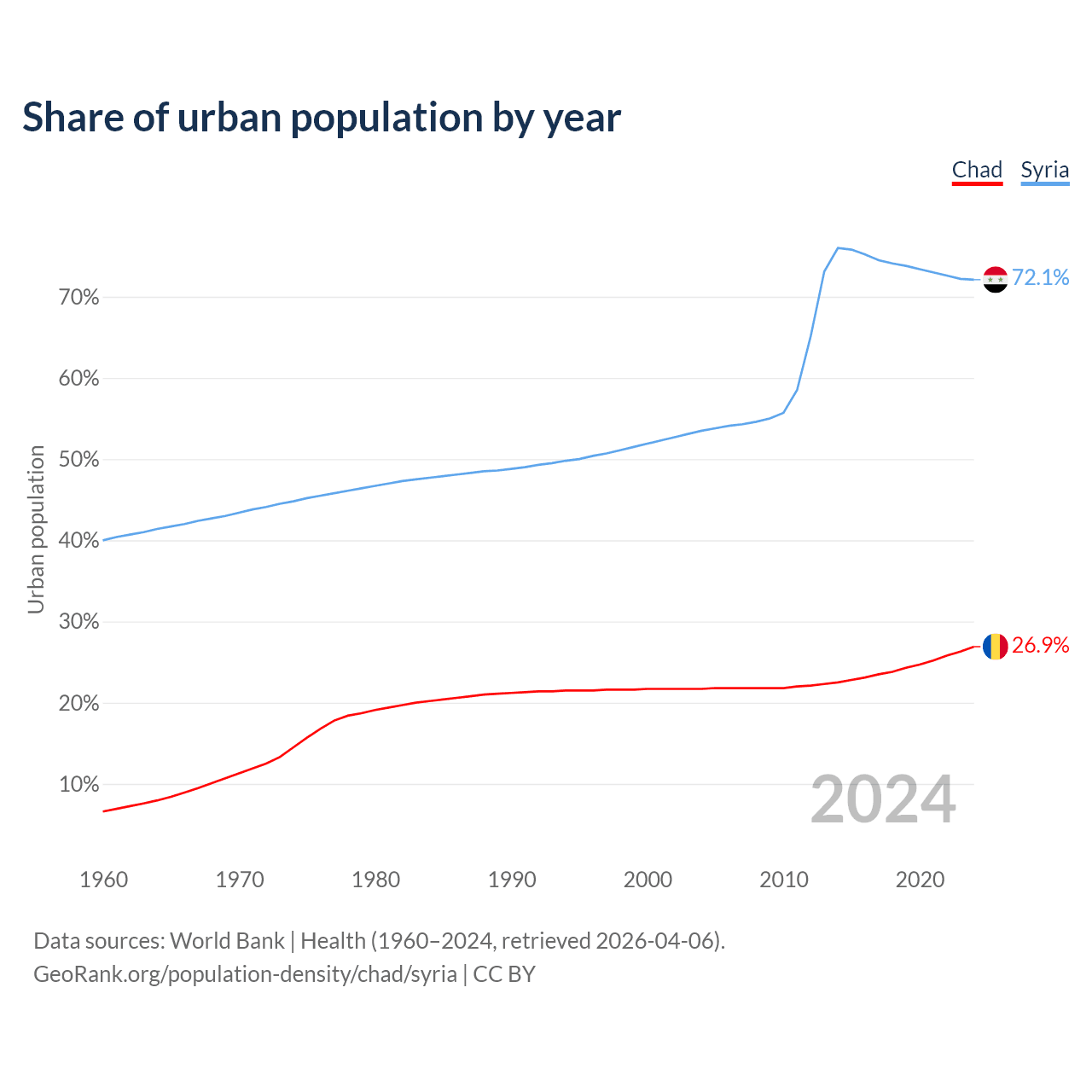 From 2004 to 2024, the share of urban population changed from 21.7% to 26.9% in Chad and from 53.5% to 72.1% in Syria.