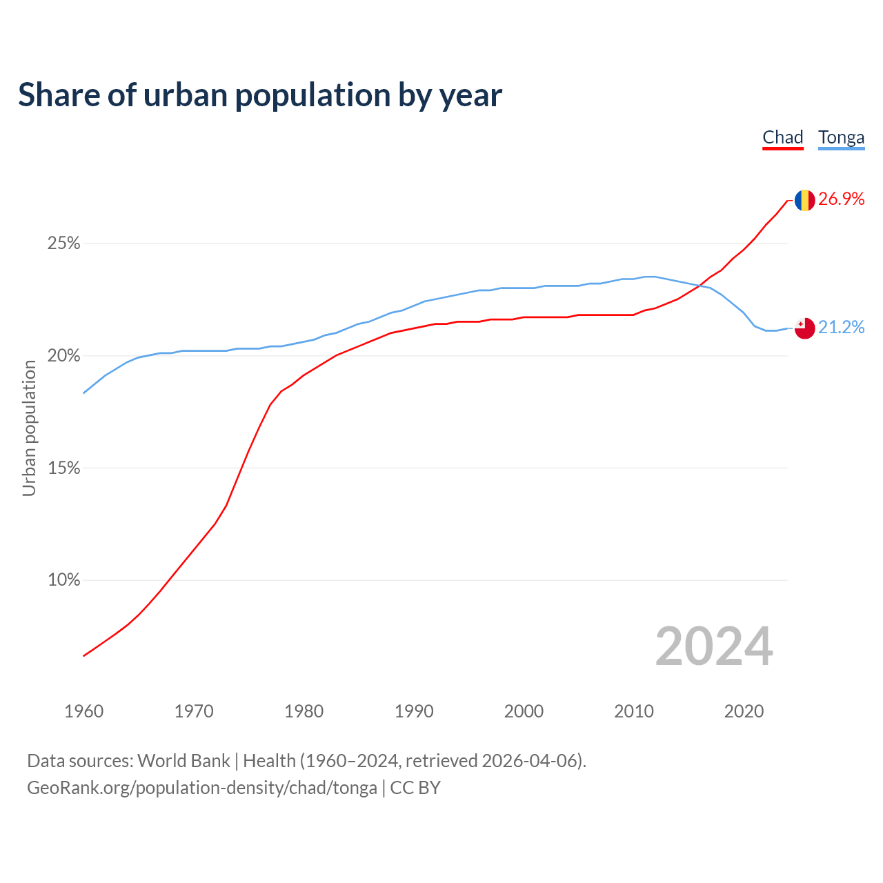 From 2004 to 2024, the share of urban population changed from 21.7% to 26.9% in Chad and from 23.1% to 21.2% in Tonga.