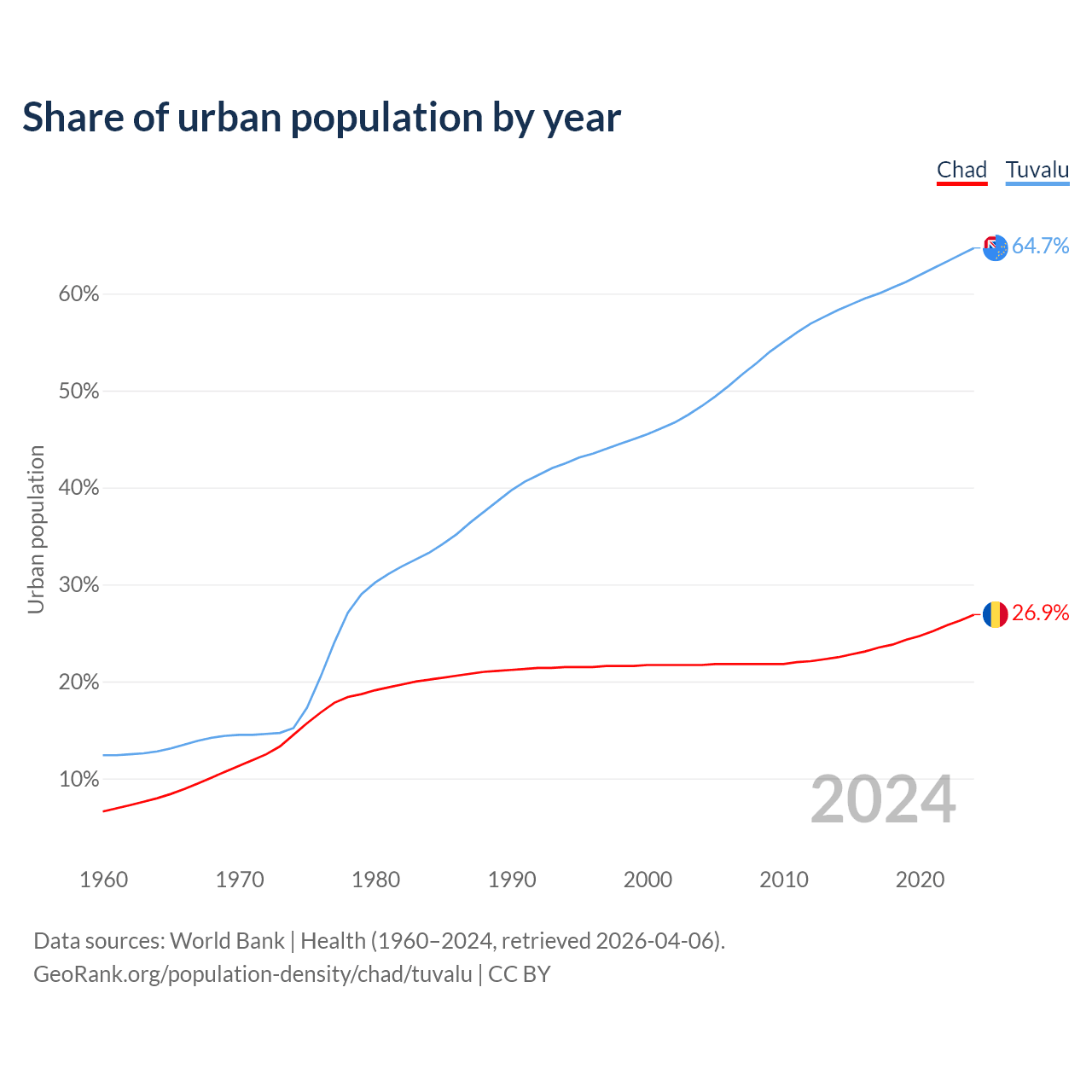 From 2004 to 2024, the share of urban population changed from 21.7% to 26.9% in Chad and from 48.4% to 64.7% in Tuvalu.