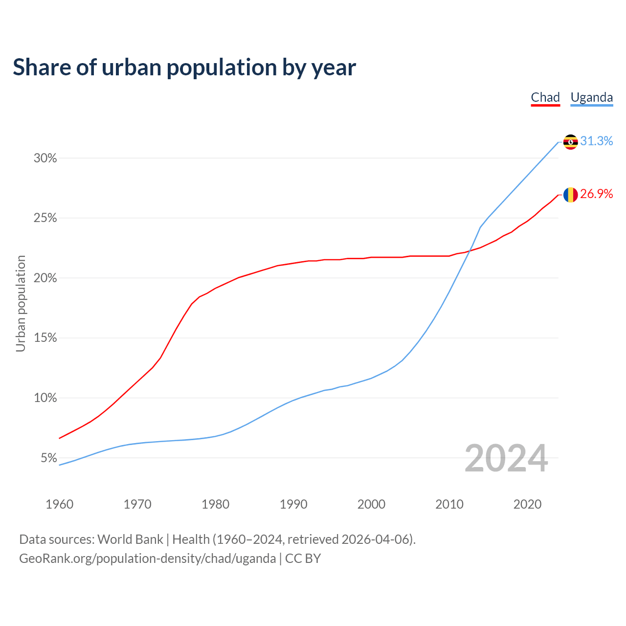 From 2004 to 2024, the share of urban population changed from 21.7% to 26.9% in Chad and from 13.1% to 31.3% in Uganda.