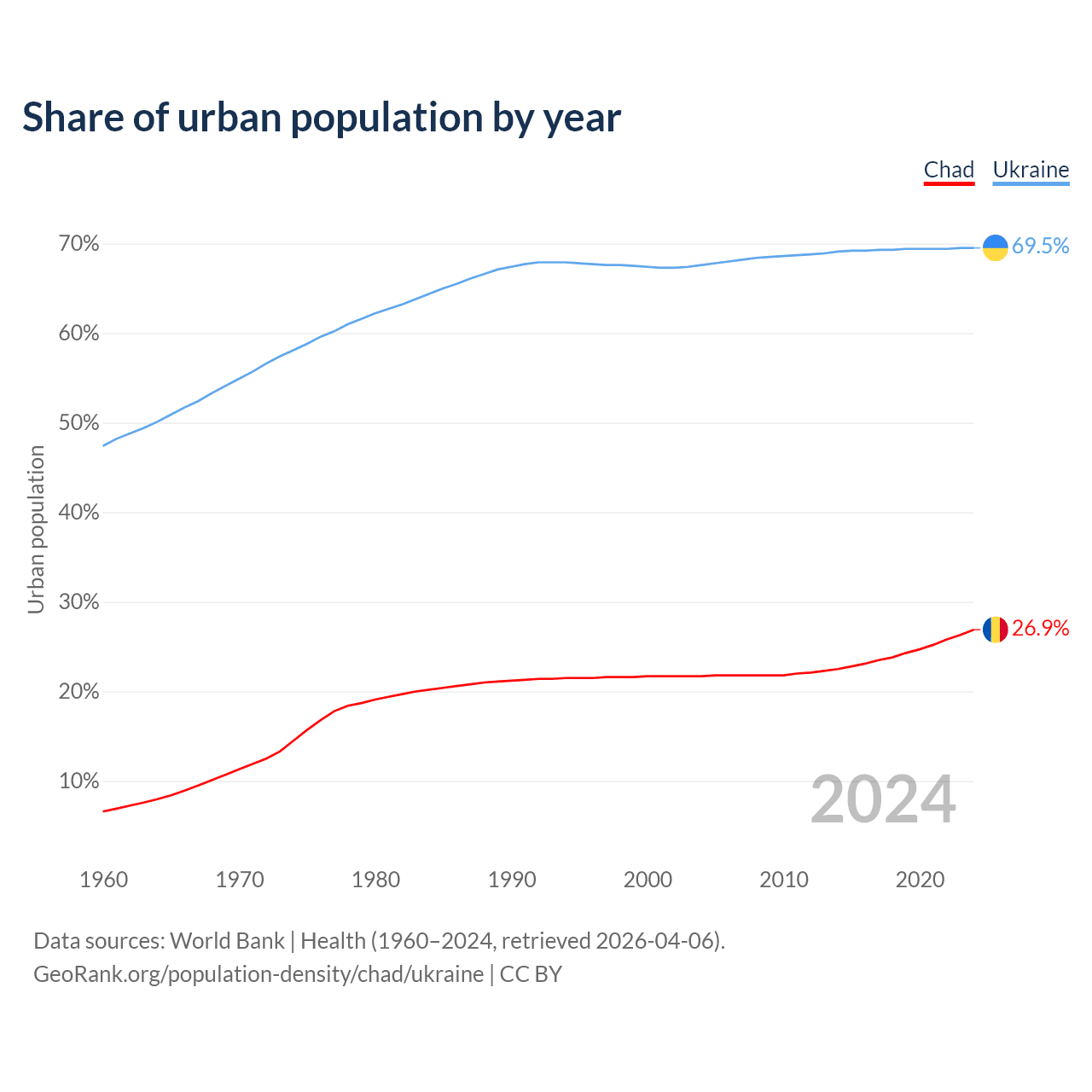 From 2004 to 2024, the share of urban population changed from 21.7% to 26.9% in Chad and from 67.6% to 69.5% in Ukraine.